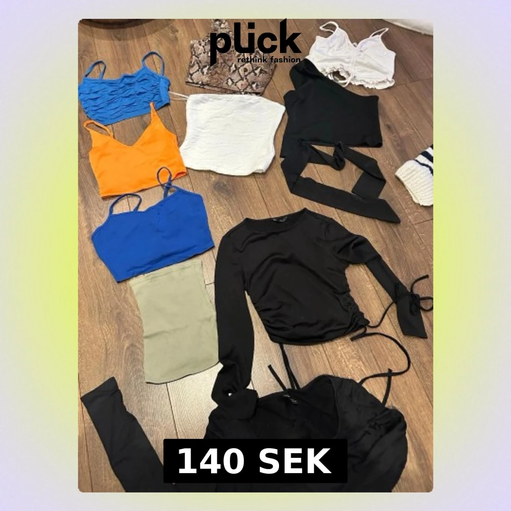 Säljer ett paket med flera snygga toppar i olika färger och modeller. Inkluderar bland annat en ormskinnsmönstrad oneshoulder topp, croppade linnen i blått, orange och vitt, samt svarta långärmade toppar med snörning och omlottdetaljer. Perfekt för dig som vill uppdatera garderoben! Blandad strl xxs / xs / s