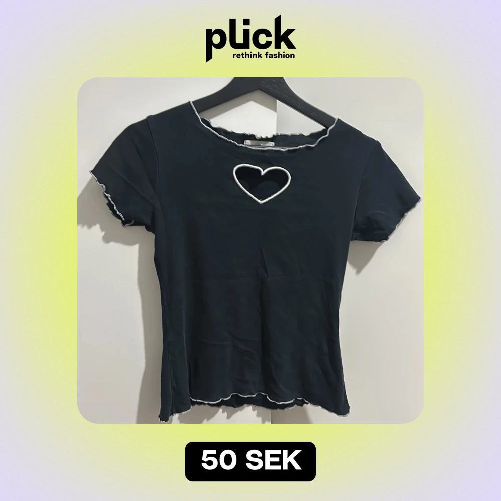 Snygg svart topp från Bershka med en söt hjärtformad detalj vid halsen. Toppen har korta ärmar och en vågig kant vid ärmslut och nederkant. Perfekt för en casual look eller en utekväll. 🖤