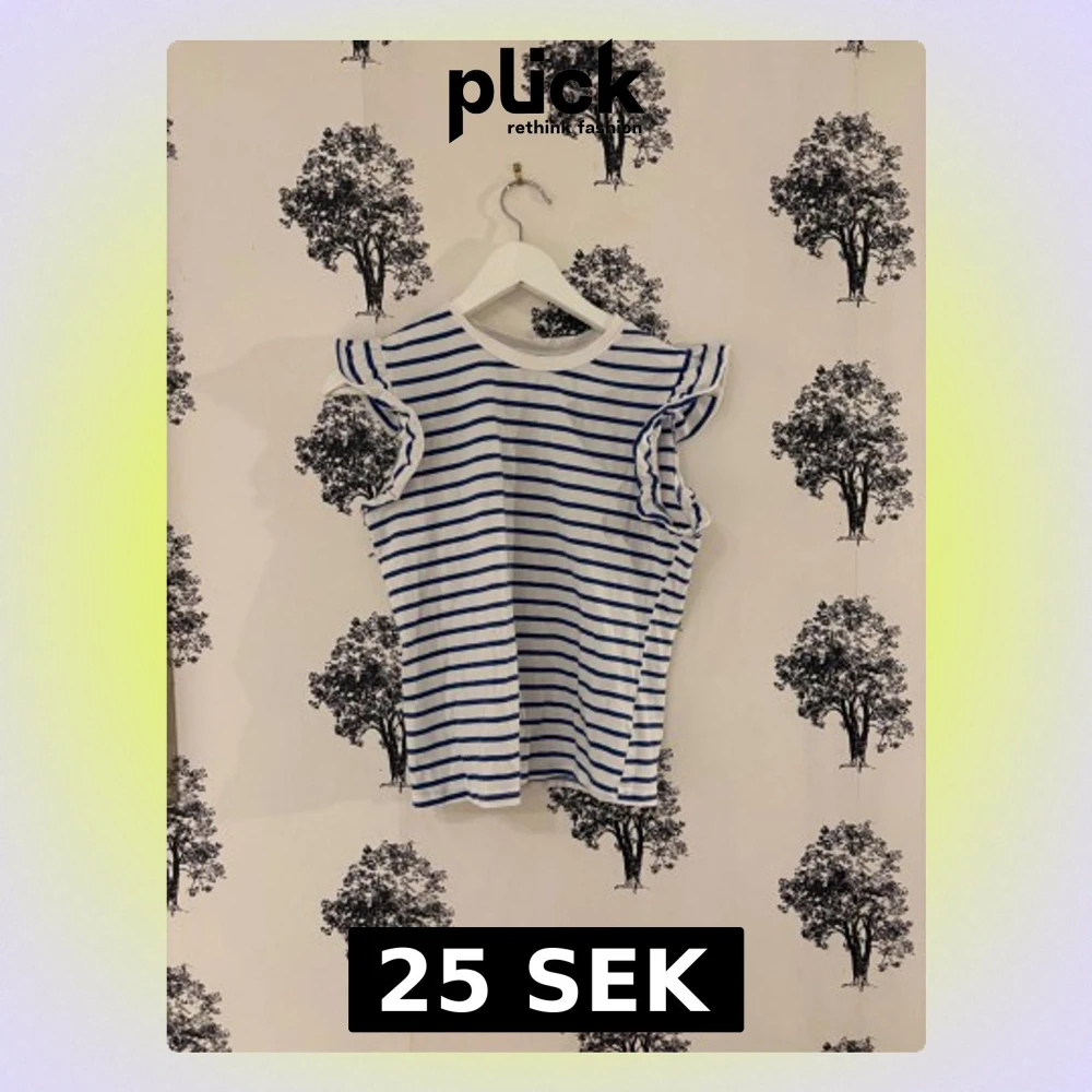 Säljer en fräsch vit topp med blå ränder från SHEIN i storlek XS. Toppen har volangdetaljer vid axlarna och är ärmlös, vilket ger en cool och lekfull vibe. Materialet är mjuk bomull och passformen är normal. Perfekt för dig som gillar klassisk stil med en twist.