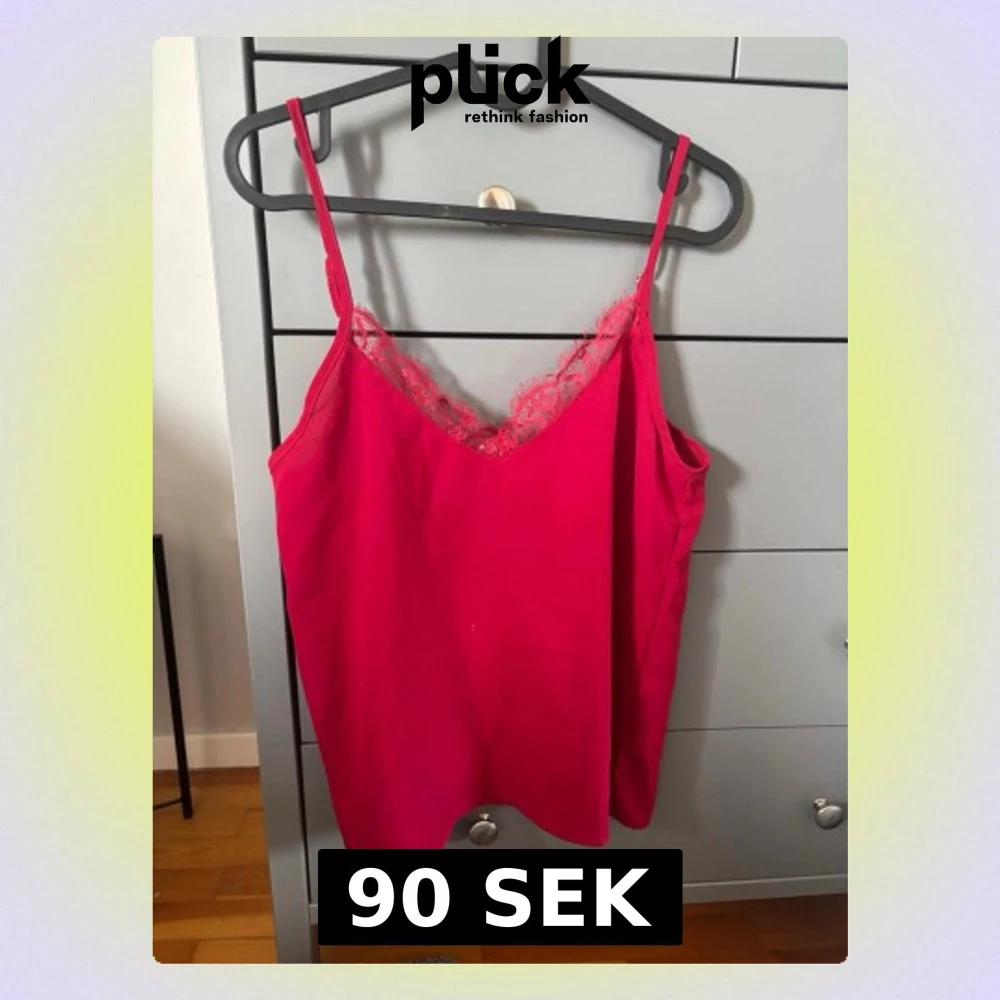 Snygg röd linnetopp med tunna axelband och spetsdetalj längs v-ringningen. Perfekt att styla till jeans eller kjol för en trendig look. Luftigt material och enkel design gör den superenkel att matcha.