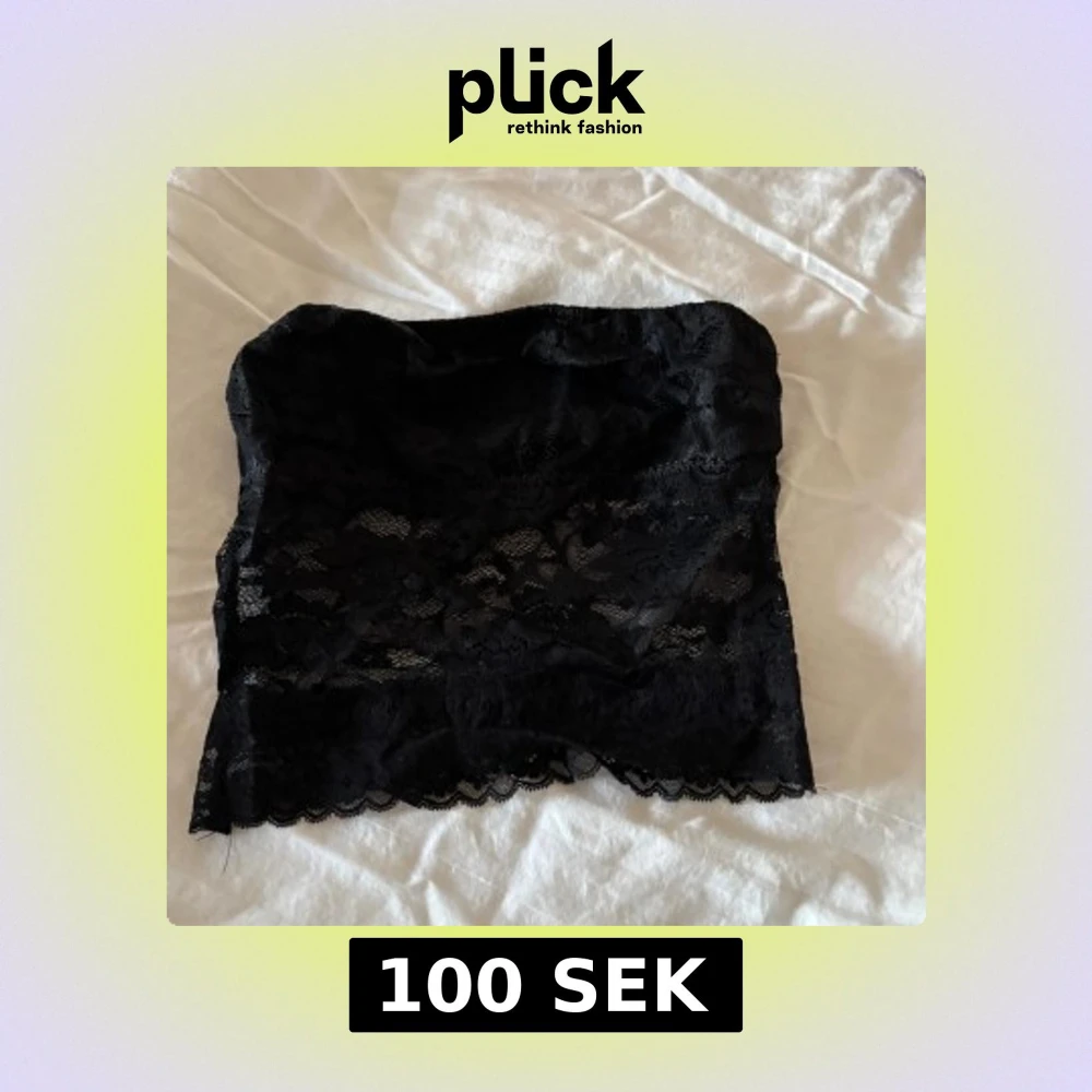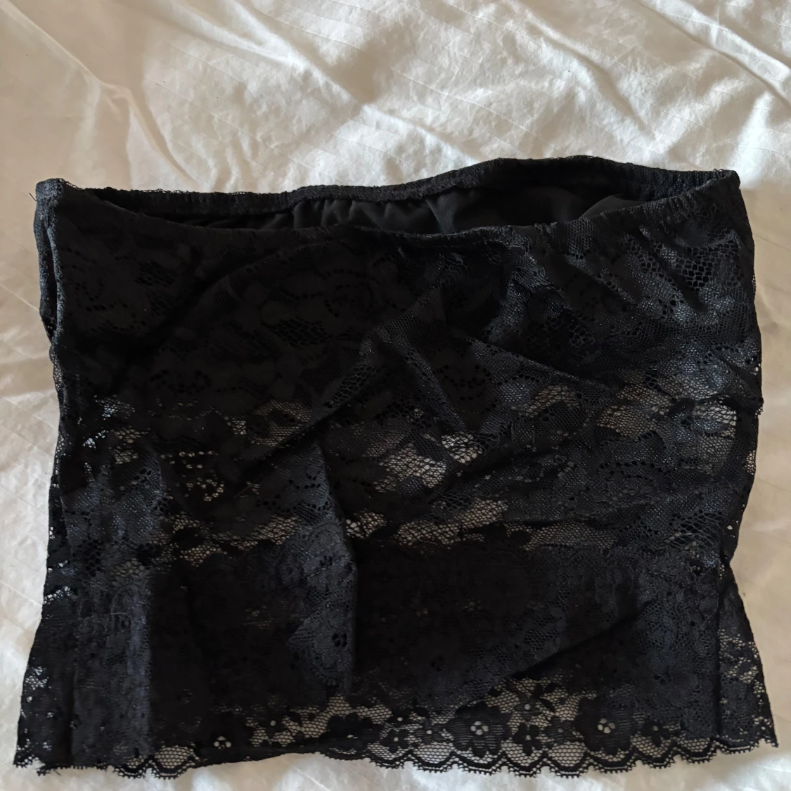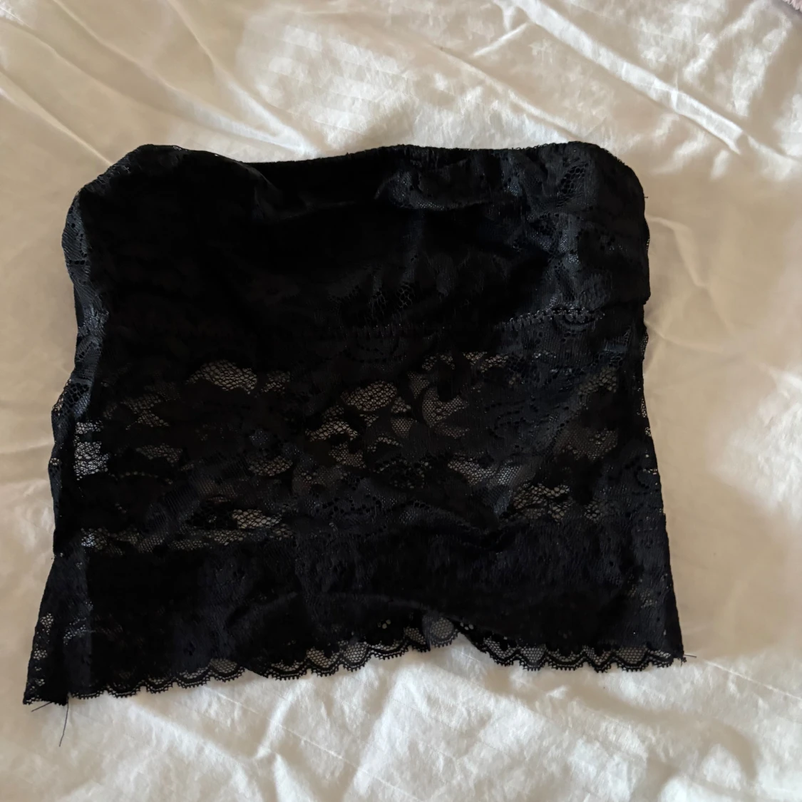Säljer en svart tubtopp i spets med fina blommiga detaljer. Toppen är axelbandslös och har en elastisk kant upptill för bättre passform.