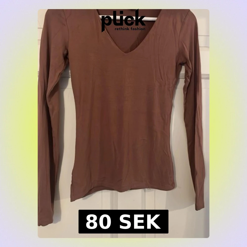Säljer en enkel och stilren brun långärmad topp med v-ringning. Toppen har en slim passform och är tillverkad i ett mjukt och stretchigt material som känns skönt mot huden. Perfekt att matcha med jeans eller kjol för en clean look.