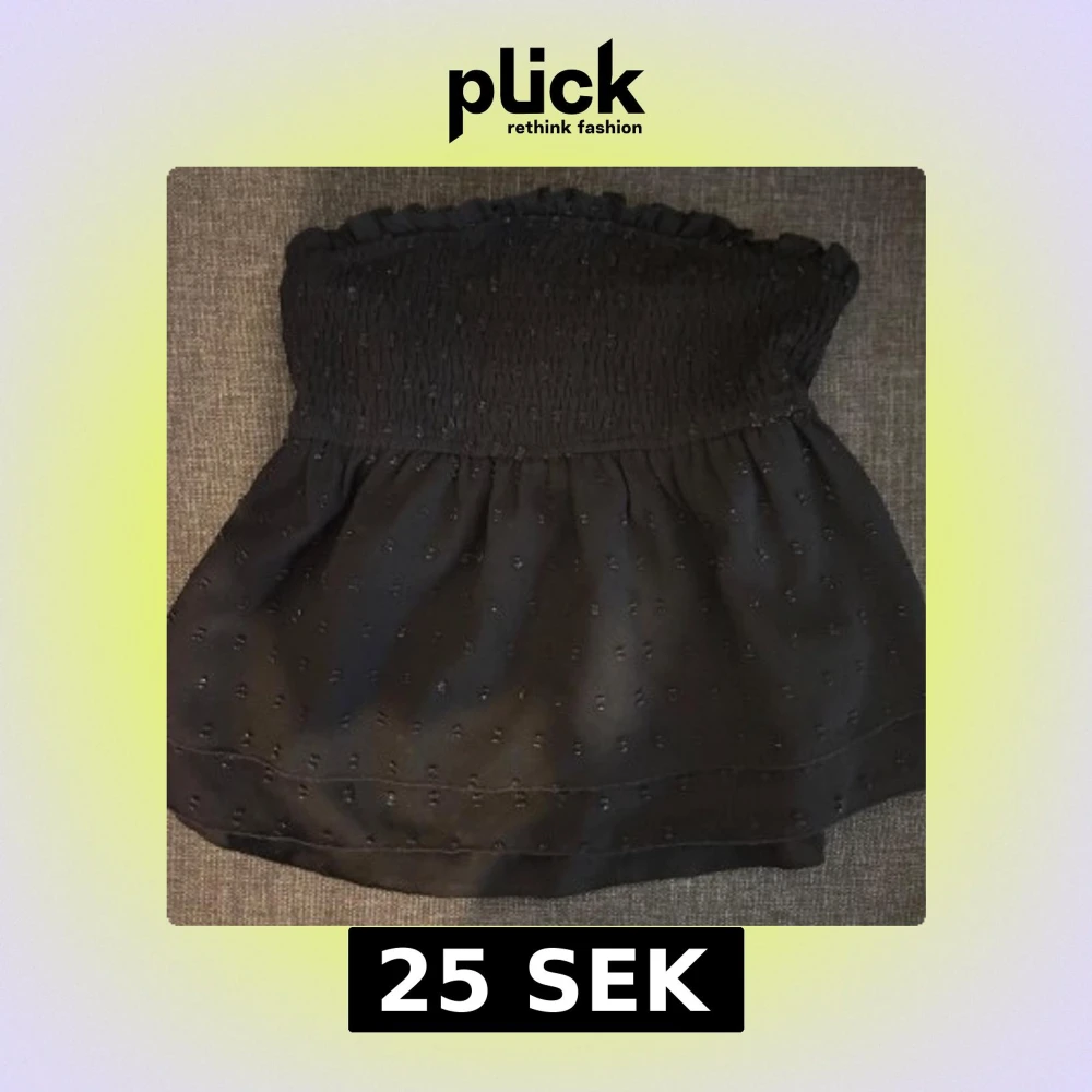Säljer en svart bandeau tubtopp med små diskreta prickar och smock upptill. Toppen är axelbandslös och har en lätt volangkant upptill för en söt touch.