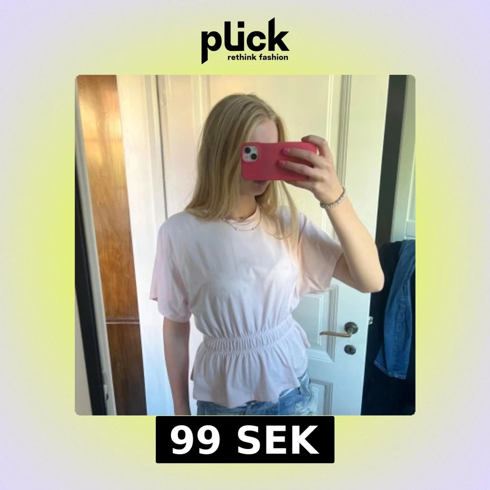 Säljer en ljusrosa blus med korta ärmar och rund hals. Toppen har en bred resår i midjan som ger en snygg volang-effekt nedtill. Perfekt till jeans eller kjol för en chill och söt look. Materialet känns mjukt och lätt.