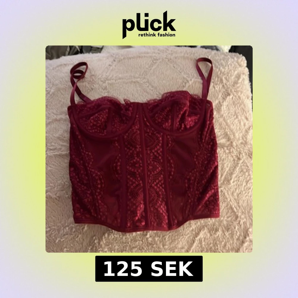 Supersnygg vinröd korsett med spets och genomskinliga meshpaneler. Justerbara axelband, dekorativa sömmar och hakknäppning bak. förliten för mig så har inga bilder med den på tyvärr.