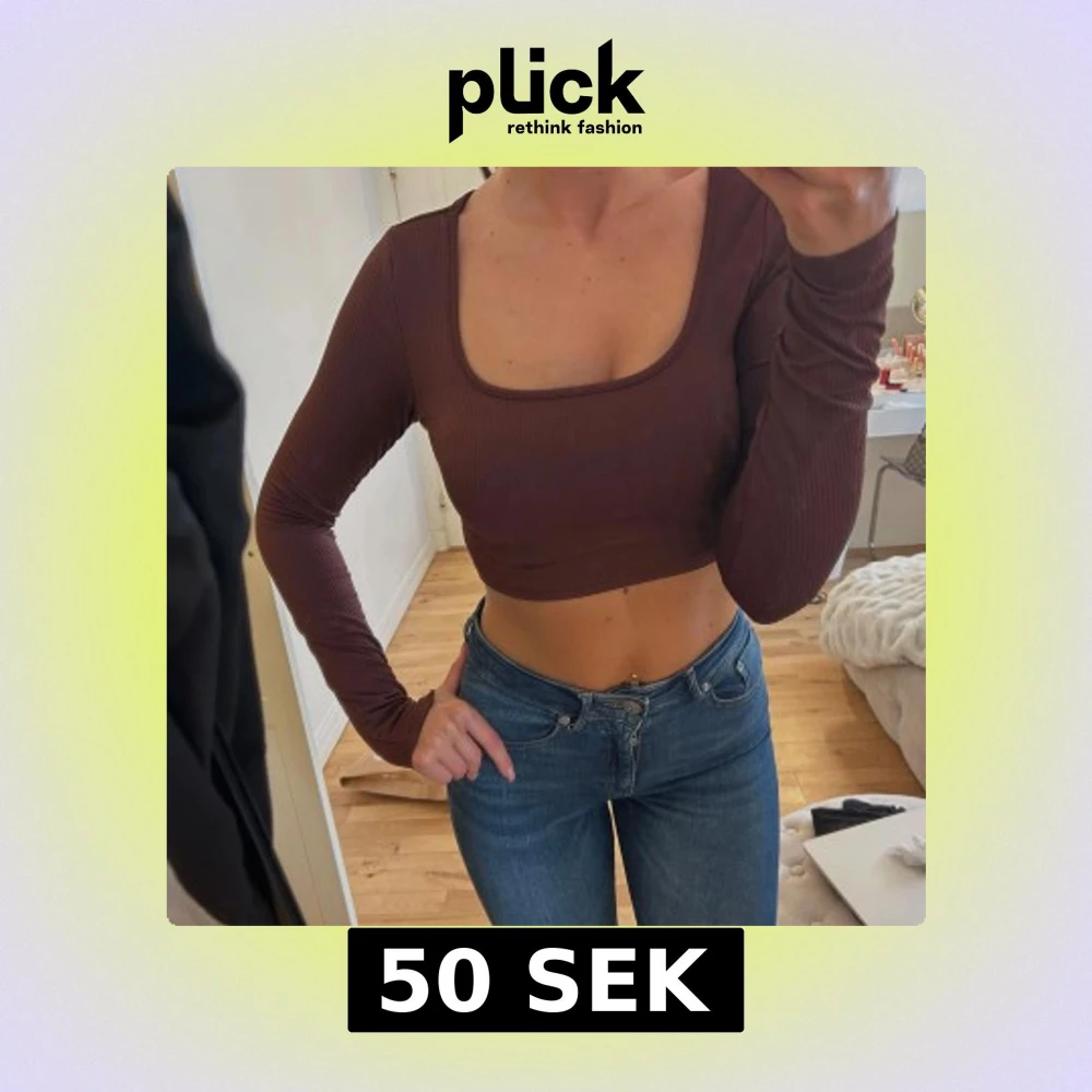 Säljer en brun croppad topp med lång ärm och fyrkantig urringning. Toppen är ribbad och sitter tight, perfekt att styla med höga jeans eller kjol. Enkel men trendig design som passar till många olika looks.
