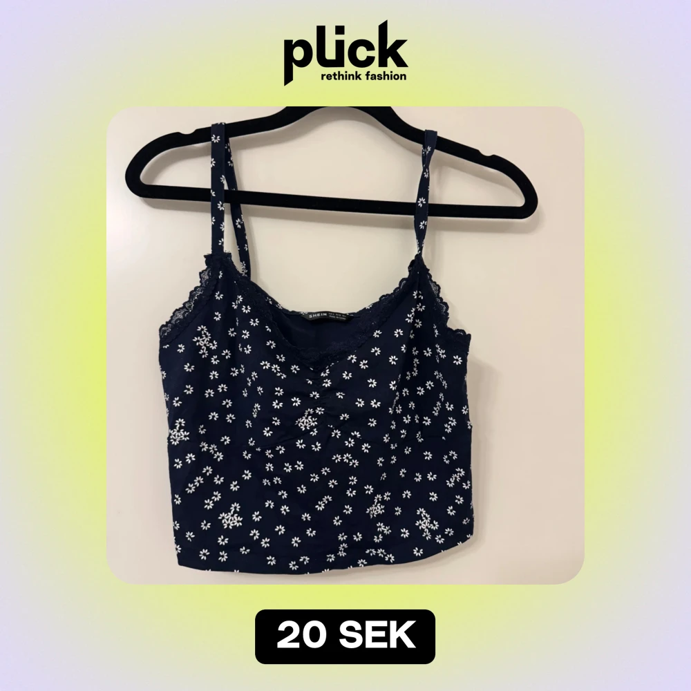 Söt marinblå linnetopp med vita blommor. Toppen har smala axelband och spetsdetaljer vid halsringningen. Använd en enstaka gång säljer då den blivit för liten.