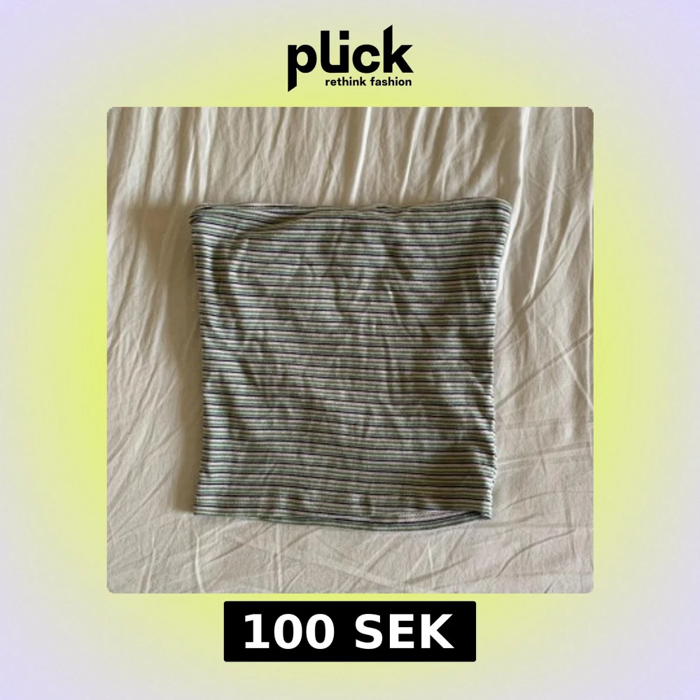 Säljer en randig bandeau tubtopp i mjuk bomull. Toppen har tunna horisontella ränder i svart, vit, grön och grå. Perfekt att styla med jeans eller kjol för en chill look. Ärmlös och axelbandslös design som sitter snyggt på plats.