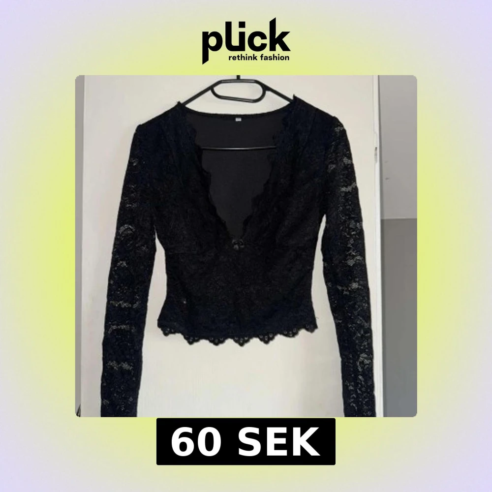Säljer en svart blus i spets med lång ärm och djup v-ringning. Blusen har fina spetsdetaljer. Säljer den då den är lite stor runt bystet. Andvänd en gång💕