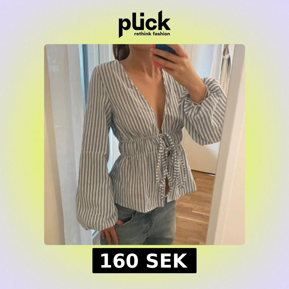 Säljer en blåvit blus med vertikala ränder och djup v-ringning. Blusen har långa, lite puffiga ärmar och snörning framtill i midjan som ger en snygg siluett. Perfekt för dig som gillar en chill och trendig look.