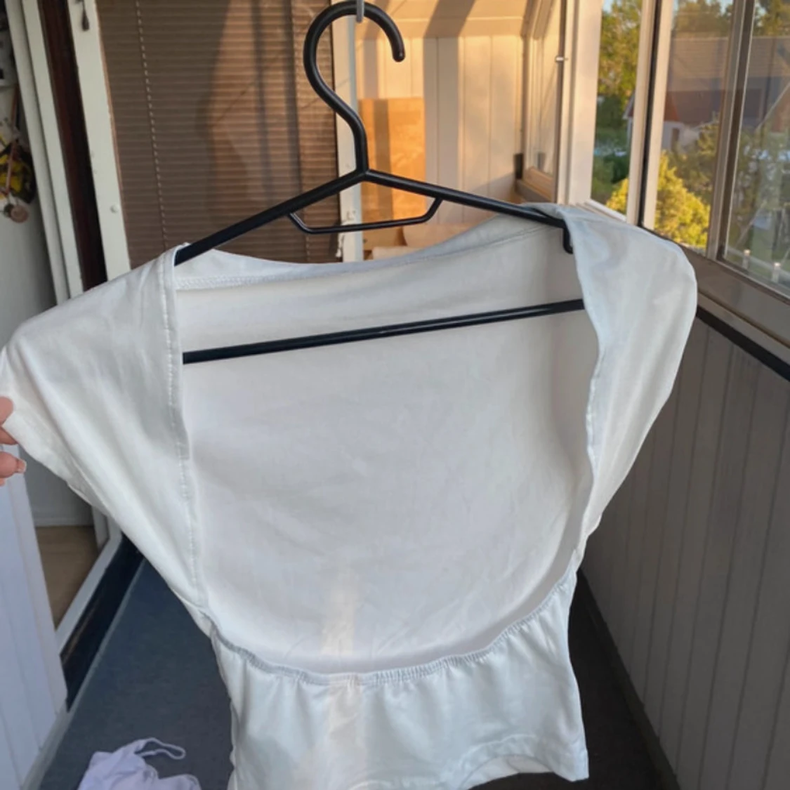 Säljer en vit topp i mjukt material med bred halsringning och öppen rygg. Toppen har korta ärmar och en lätt insvängd midja. Perfekt för dig som gillar en enkel men ändå snygg stil.