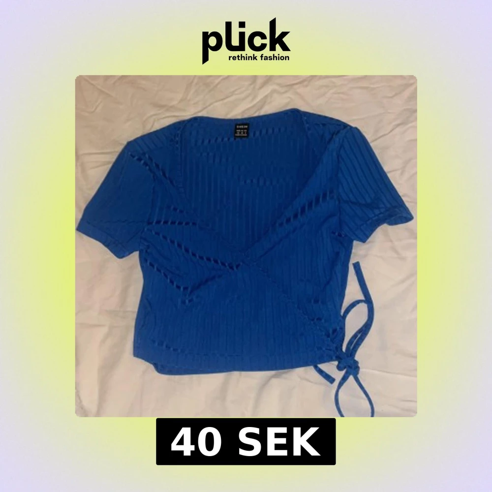 Säljer en blå omlottopp från SHEIN i storlek XS. Toppen har korta ärmar, ribbat mönster och snygg knytning i sidan. Materialet är mjukt och stretchigt, perfekt för dig som gillar en croppad look med lite edge. Passar dig som vill ha en cool och enkel topp.
