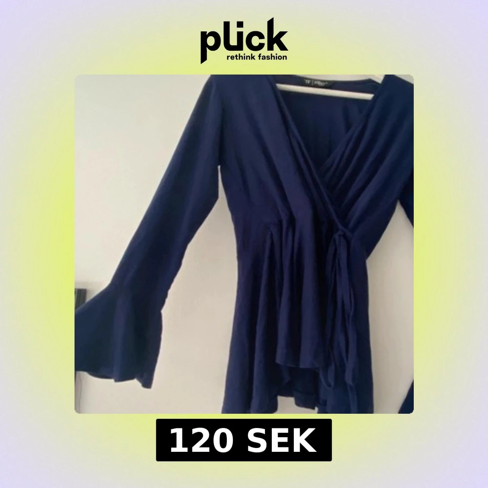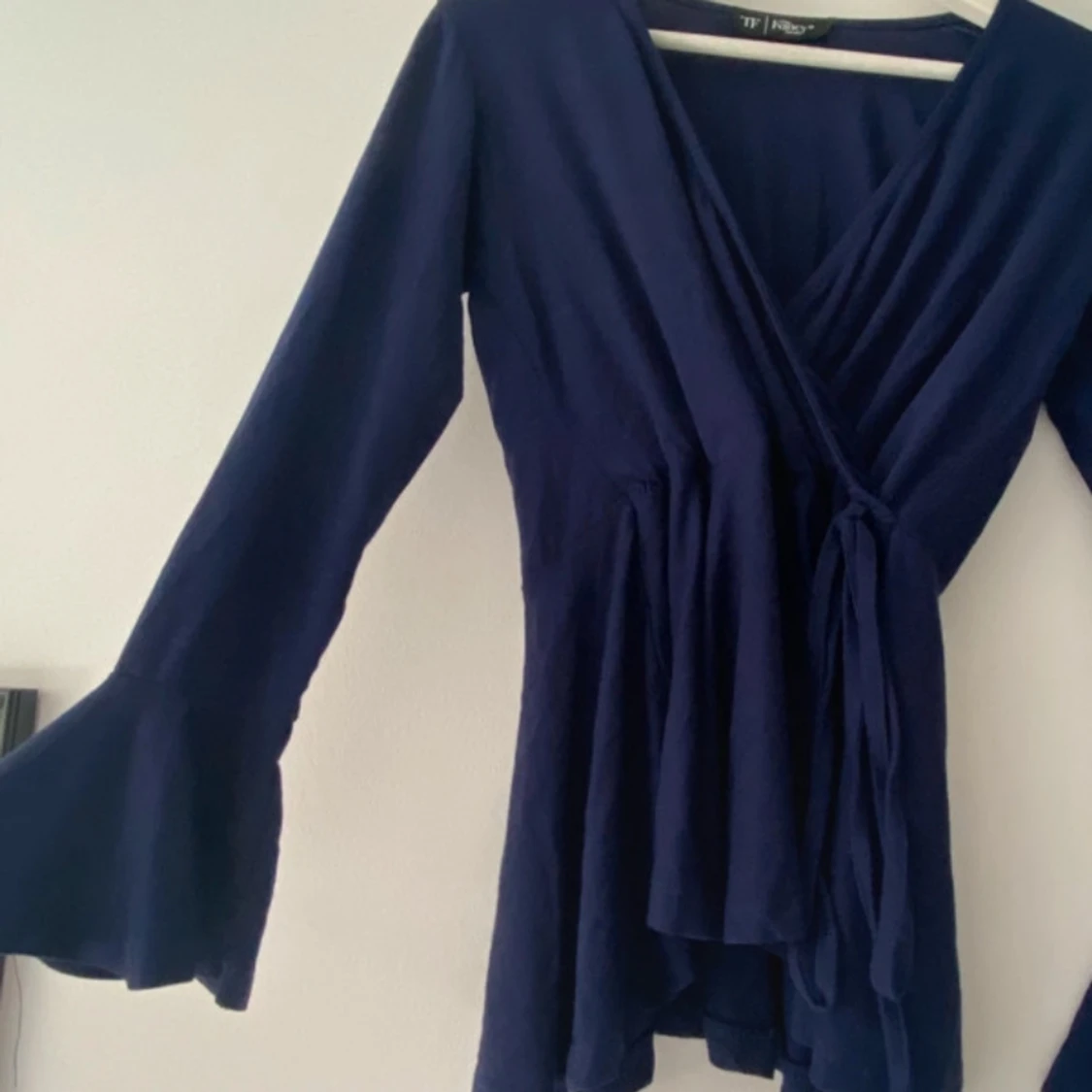Supersnygg mörkblå omlottopp med långa volangärmar. Toppens omlottmodell ger en v-ringad look och det flowiga tyget gör den extra skön att bära. Passar xs/S
