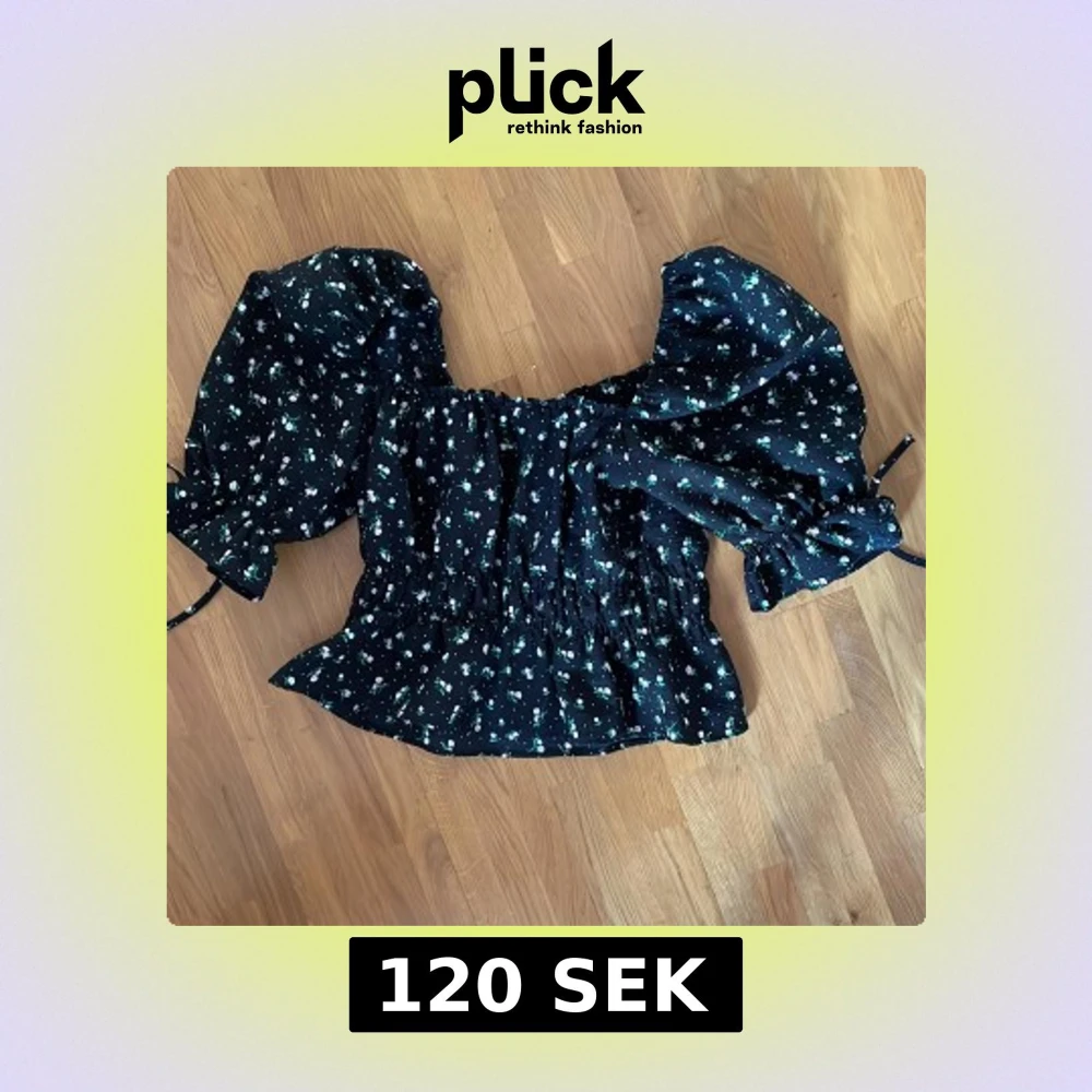 Supersöt svart blus med små blommor i grönt och vitt från H&M Divided. Modellen har puffiga långa ärmar med knyt vid handlederna, smockad midja och fyrkantig ringning. Perfekt för dig som gillar romantisk och trendig stil.