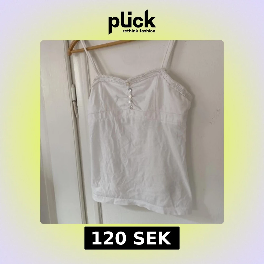 Söt vit linnetopp med justerbara axelband och söta knappar framtill. Toppen har en fin volangkant längs urringningen och är 100% bomull. Perfekt för varma dagar och enkel att matcha med jeans eller kjol. Strl XS/S. Pyyyytteliten fläck som syns på sista bilden (typ omöjlig att märka).