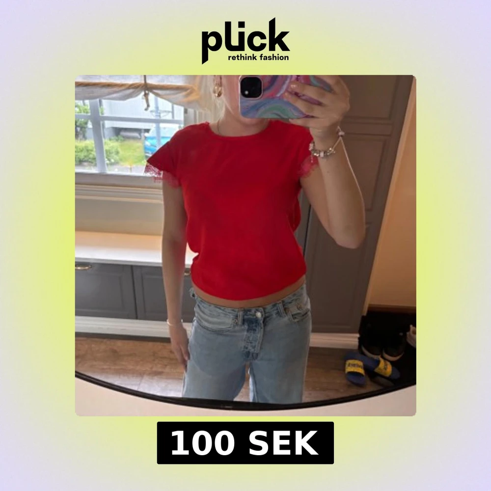 Säljer en röd topp med korta ärmar och spetsdetaljer längs ärmslut och en sned öppen rygg. Toppen har en croppad passform och är perfekt för dig som vill sticka ut lite extra.
