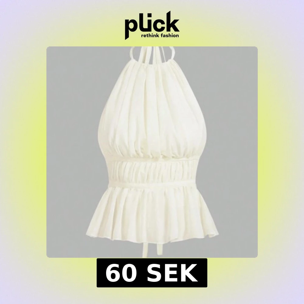 Supersöt vit linnetopp med omlott och volangkant. Toppen har halterneck med knyt i nacken och smockad midja som ger en snygg siluett. Perfekt för sommarens alla häng och passar till både jeans och kjol.