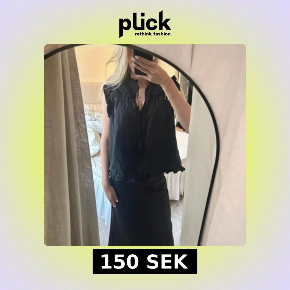 Säljer en svart blus med söt knytning vid halsen och volangdetaljer längs krage och nederkant. Blusen är ärmlös och har en luftig, loose passform som ger en avslappnad men ändå chic look. Perfekt att styla med kjol eller jeans.