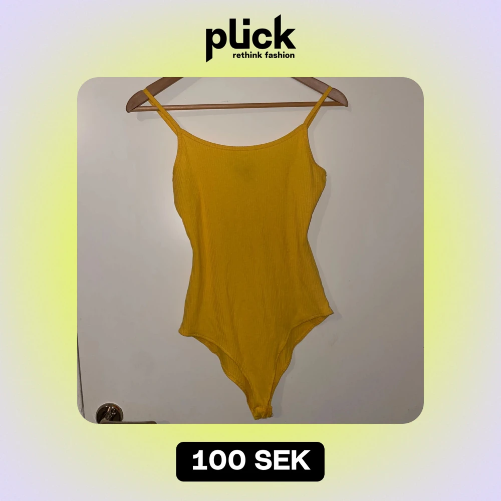 Snygg gul body i ribbat material, perfekt för sommaren! Den har smala axelband och en enkel, stilren design som passar både för stranden och stan. Materialet är stretchigt och bekvämt, vilket ger en bra passform. Den är aldrig använd men lappen finns ej kvar. Storlek XS men stor i storleken så passar även någon med storlek M.