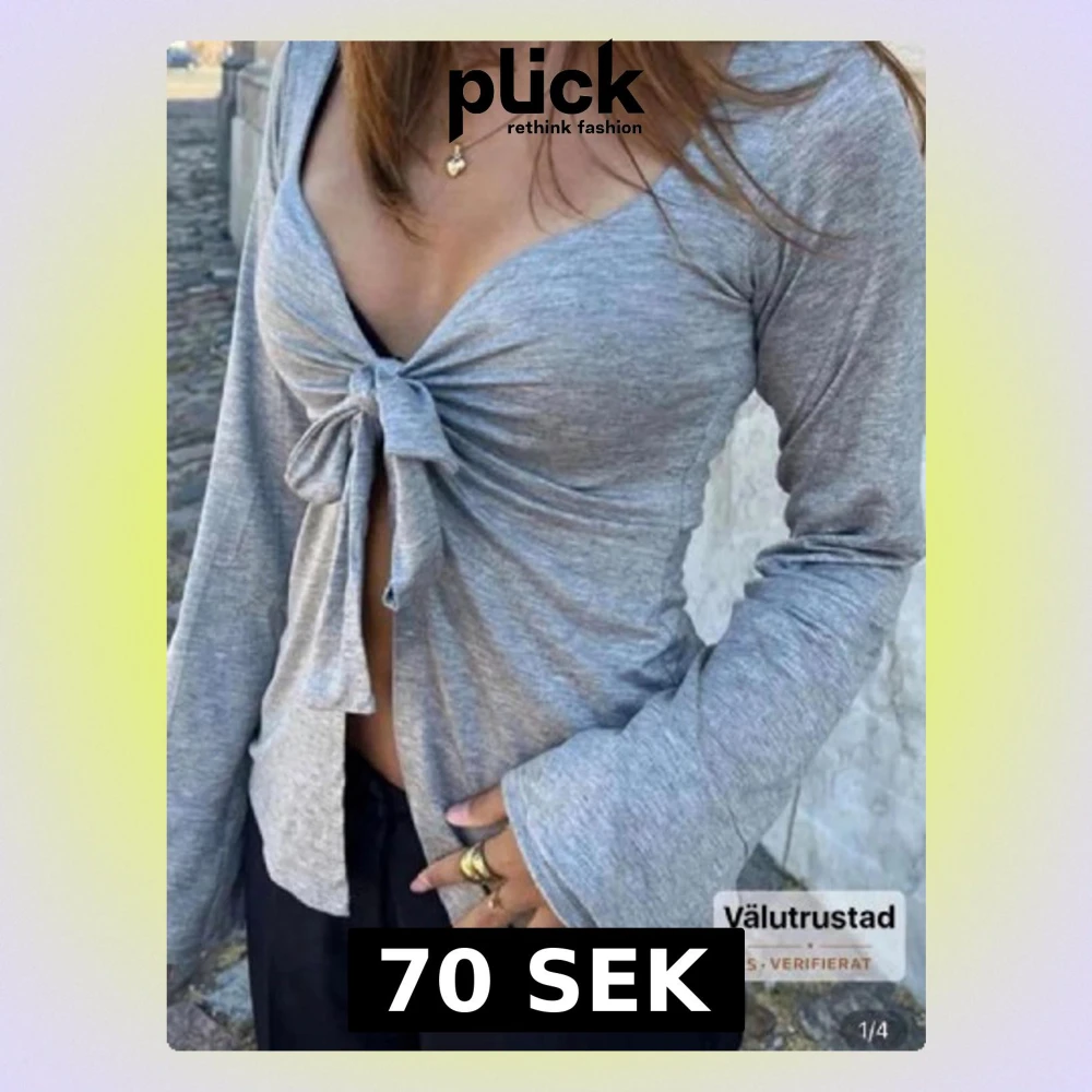 Ljusgrå långärmad topp med v-ringning och snygg öppning och knytning framtill. Materialet känns mjukt och stretchigt, troligen polyester. Modellen är figurnära och croppad, perfekt för att ge en cool och trendig vibe.