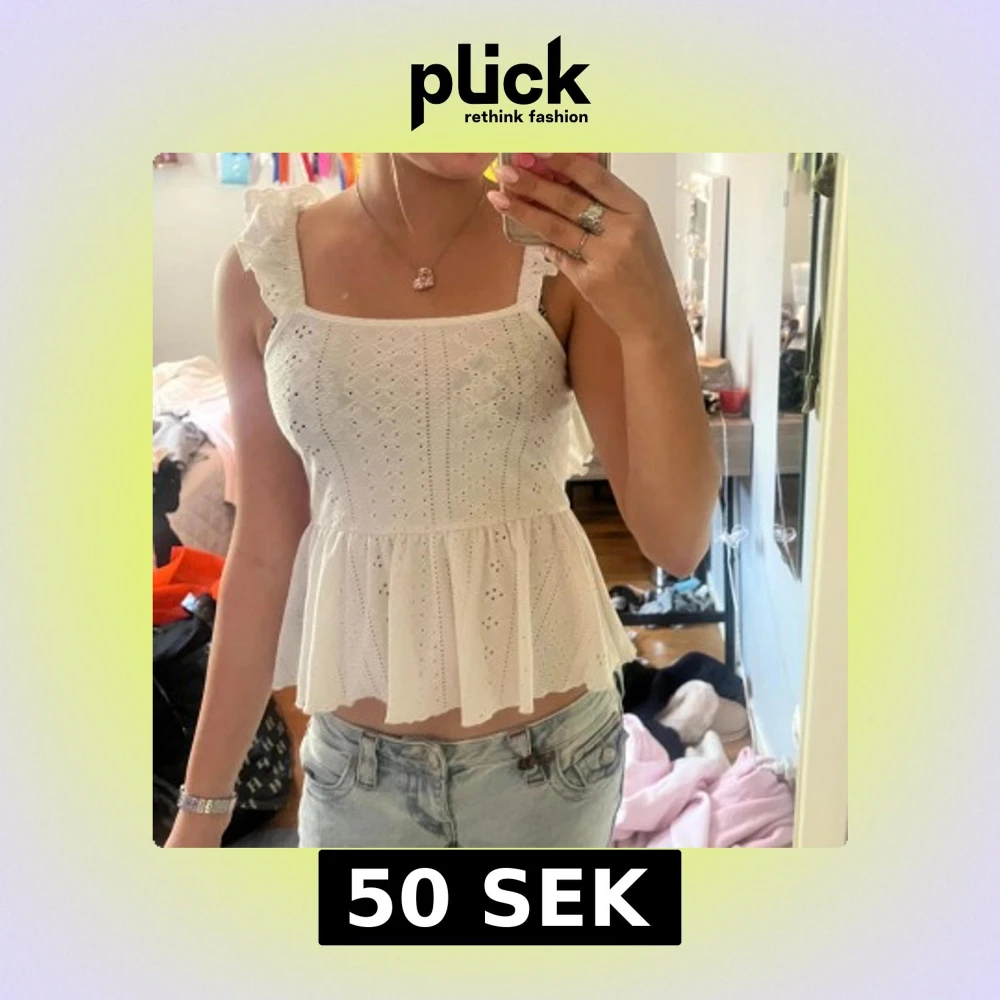 Supersöt vit blus med broderade detaljer, volangaxlar och öppen rygg med knytband. Luftig och lätt med romantisk känsla, perfekt till jeans eller kjol. Den har fyrkantig ringning och är ärmlös med breda axelband.