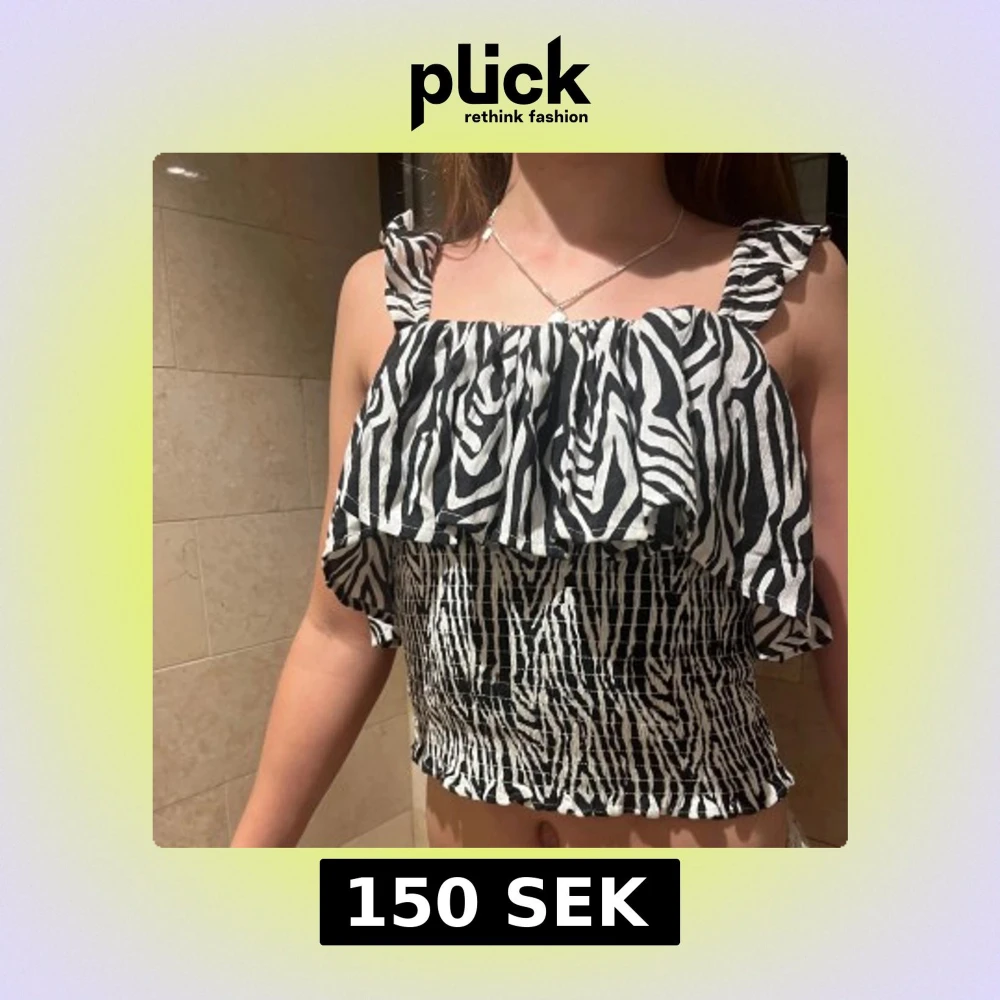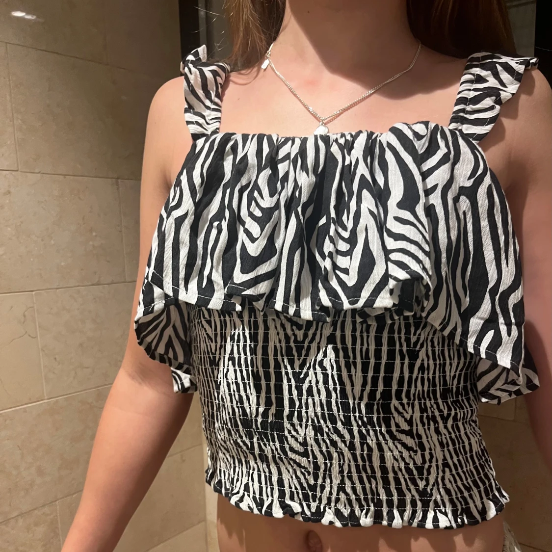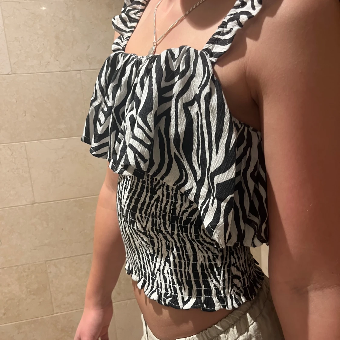 Snygg zebramönstrad topp med volangdetaljer och smockad nederdel. Axelbanden är volangprydda och ger en extra touch. Perfekt för en trendig look.