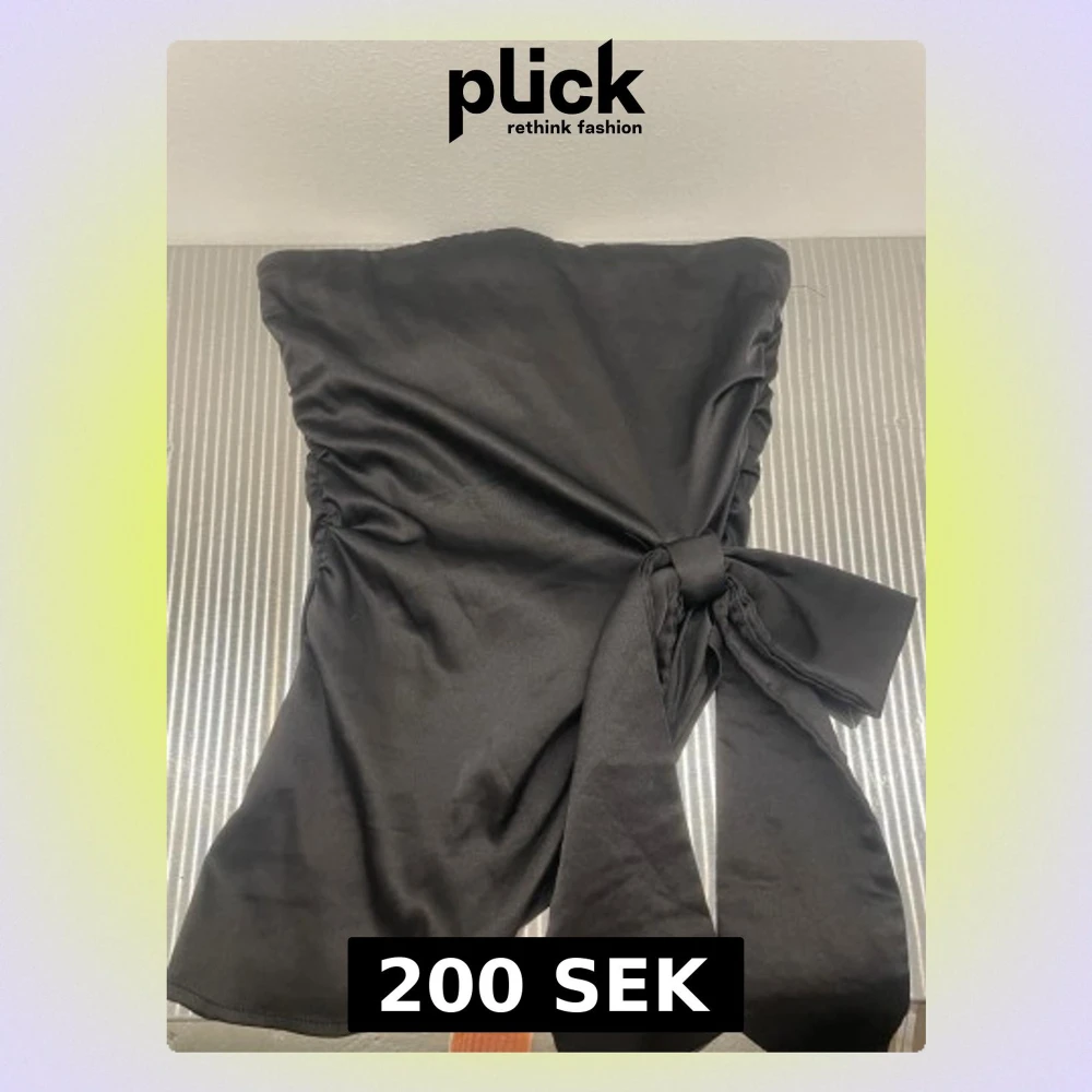 Snygg svart axelbandslös tubtopp i satinliknande material med stor knytrosett framtill. Toppen har en elegant och stilren look, perfekt för att lyfta vilken outfit som helst. Materialet ger ett lyxigt intryck och toppen sitter tight runt överkroppen.