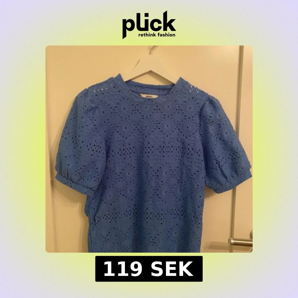 Säljer en söt blå spetsblus från Object. Blusen har korta ärmar och ett vackert spetsmönster som ger en romantisk känsla. Perfekt för vår och sommar!