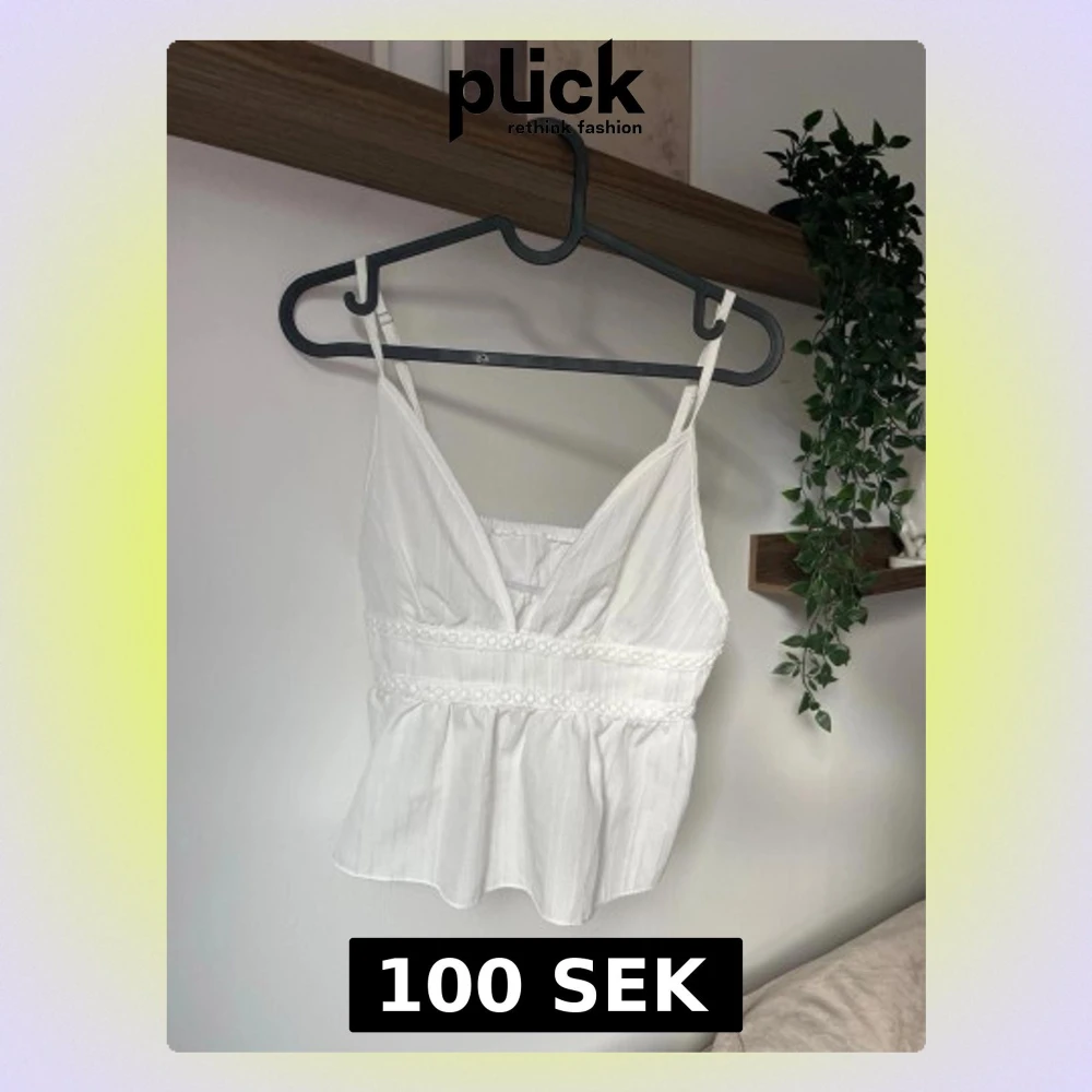 Söt vit linnetopp med smala axelband och v-ringning. Toppen har spetsdetaljer under bysten och volang nedtill för en romantisk vibe. Perfekt till sommaren och lätt att matcha med jeans eller kjol.