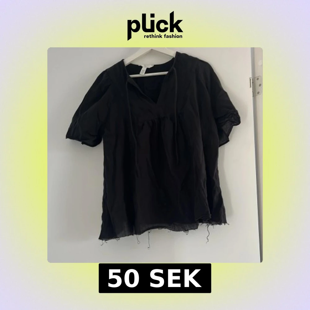 Svart blus från H&M Mama i luftig bomull med korta puffärmar och v-ringning med knytband. Blusen har avslappnad passform och råa kanter nertill för en chill vibe. Perfekt för dig som vill ha något bekvämt och snyggt. Toppen är nedklippt nere vis tröjan därav trådarna som hänger ner