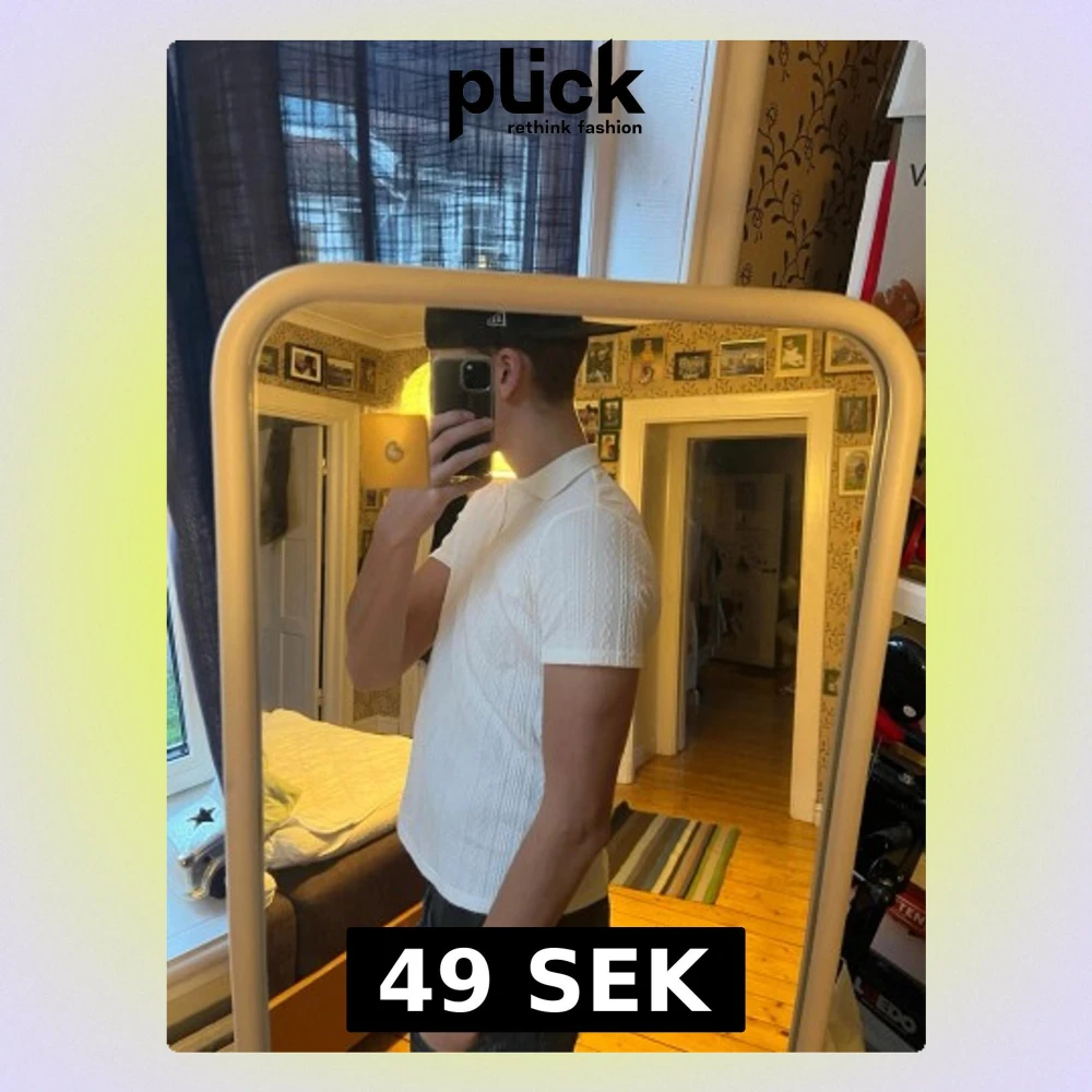 Säljer en stilren vit polotopp med korta ärmar och klassisk krage. Toppen har ett ribbat mönster som ger en snygg struktur och sitter normalpassat. Perfekt till jeans eller shorts för en clean look.