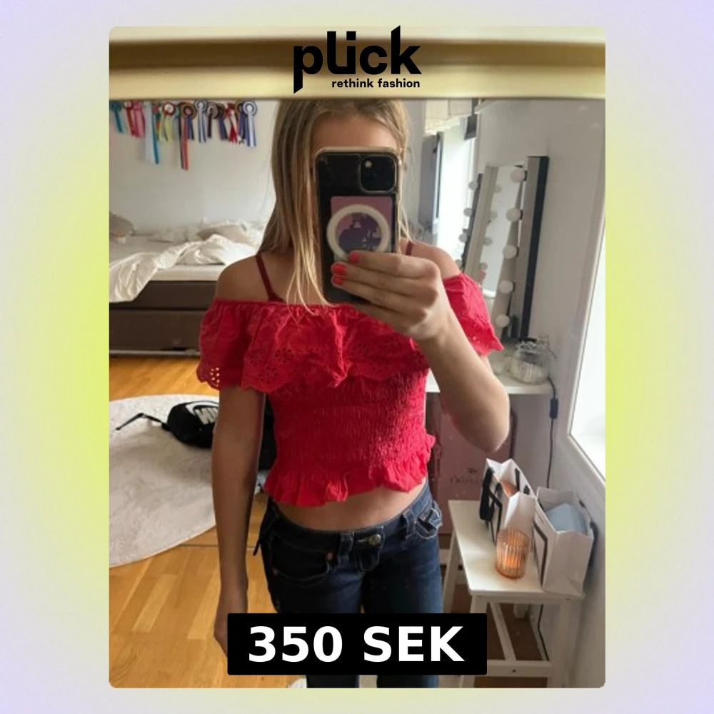 SĂ€ljer en söt korall offshoulder topp med volangdetaljer. Perfekt för sommardagar och ger en romantisk vibe.đ