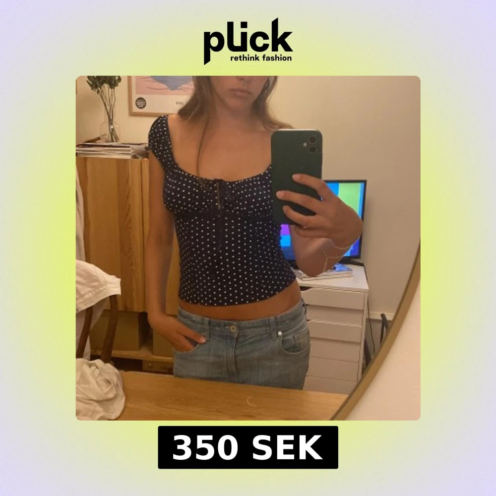 Supersöt mörkblå topp från Jane norman med vita prickar, söt snörning framtill och puffade axelband. Så himla fin att ha till fest eller middagar!