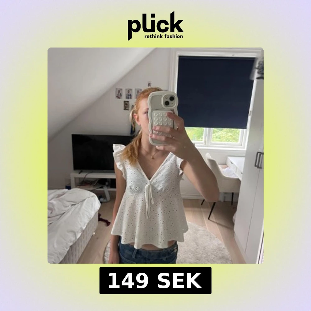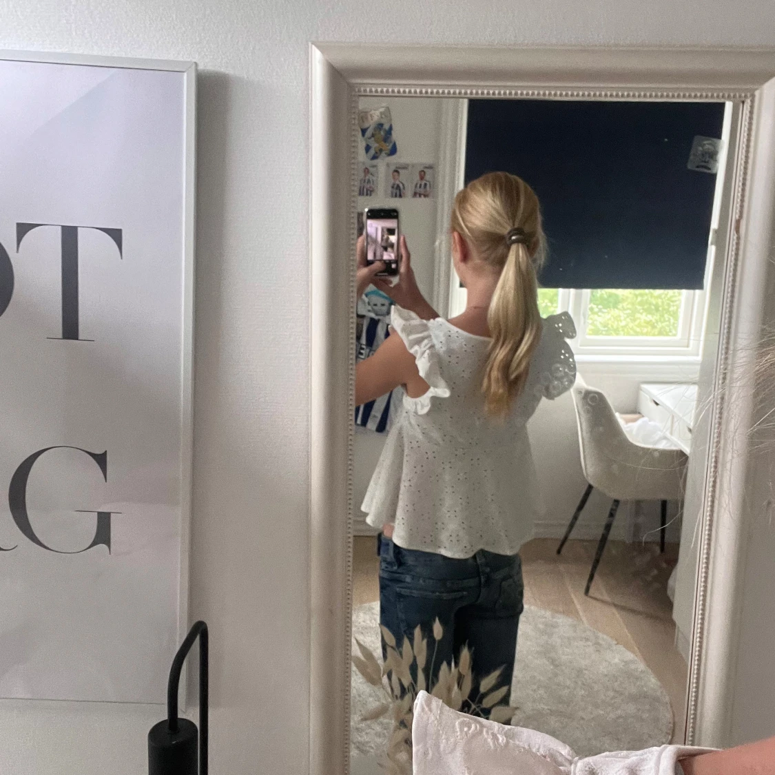 Supersöt vit blus med broderade hål och volangärmar. Prislapparna är borta så vet inte vart den kommer ifrån! Tror att stoleken är runt S-XS💕