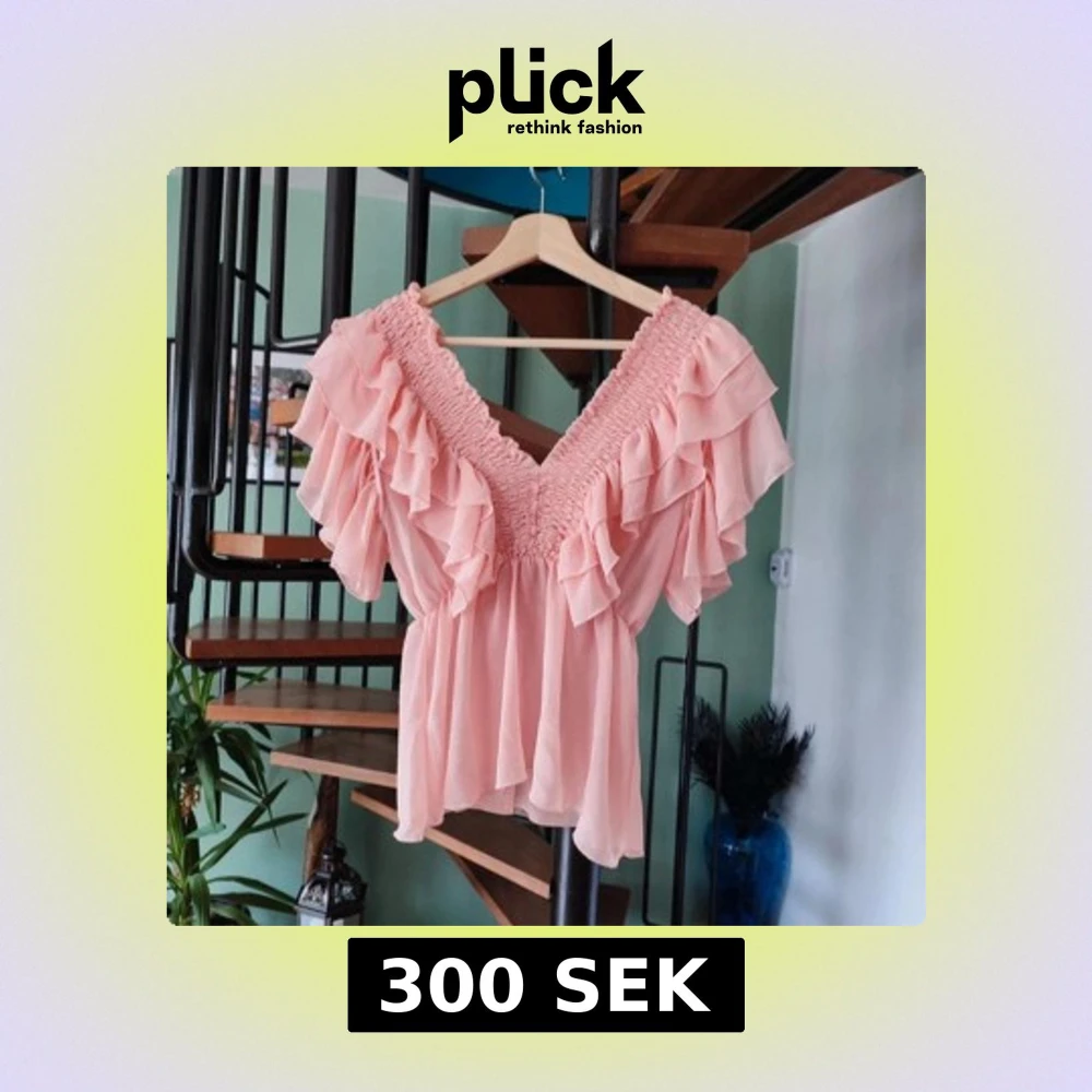 Söt rosa blus med djup v-ringning och flera lager volanger längs axlar och byst. Blusen har korta ärmar och smockad överdel som ger en feminin och luftig känsla. Perfekt för vår och sommar.