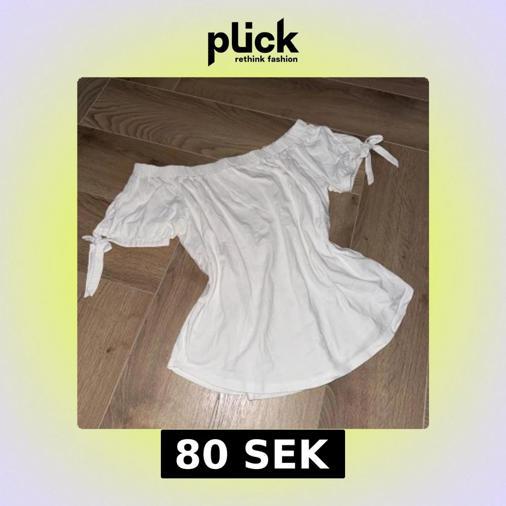 Säljer en söt vit offshoulder blus med korta ärmar och knytband vid ärmsluten. Perfekt för en somrig look! 💫💗