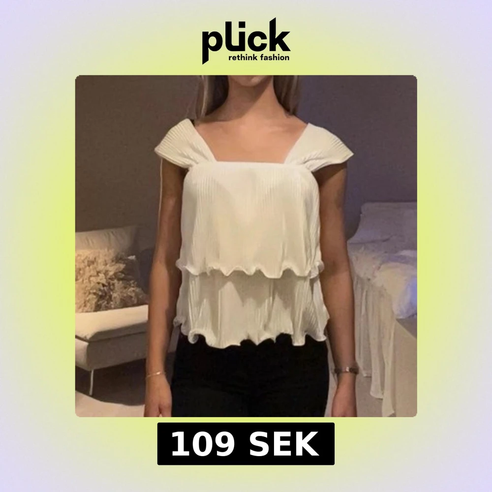 Säljer en vit blus med plisserat tyg och dubbla volanger. Toppen har breda axelband och en snygg v-ringning både fram och bak.