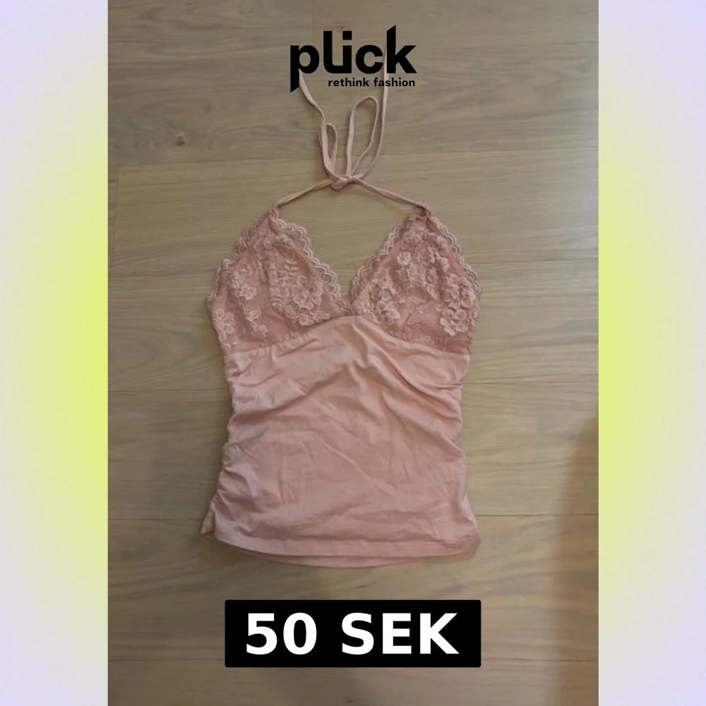 Supersöt ljusrosa linnetopp med spetsdetaljer och blommigt mönster över bysten. Toppen har smala axelband som knyts i nacken och en omlottkänsla framtill. Materialet är mjukt och stretchigt, perfekt för varma dagar eller när du vill känna dig extra fin.