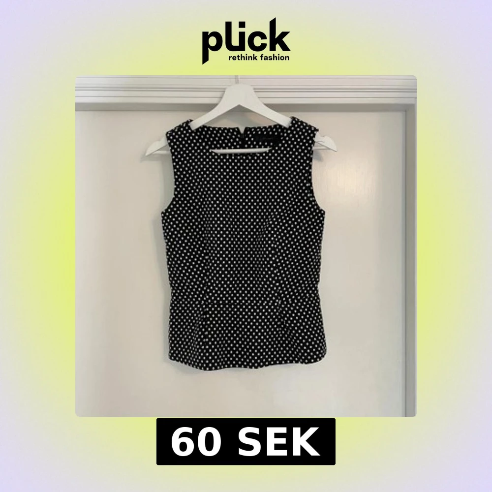 Snygg svart blus med vita prickar och ärmlös design. Toppen har rund halsringning och lätt figursydd passform som ger en klassisk men trendig look. Perfekt att styla med jeans eller kjol för en cool vibe.