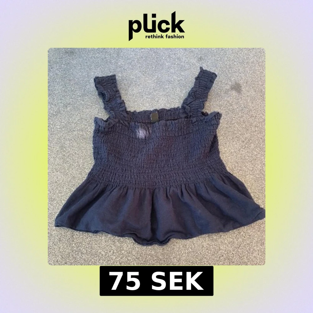 Supersöt mörkblå linnetopp med smockad överdel och breda axelband med volangdetaljer. Toppen har en utställd volang nertill som ger en lekfull look. Perfekt för varma dagar och enkel att styla med jeans eller kjol.