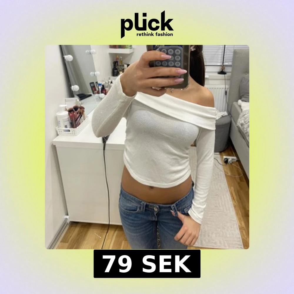 Säljer en vit croppad topp med offshoulder-design och långa ärmar. Toppens material har en lätt glansig yta och sitter tight mot kroppen. Perfekt för dig som vill ha en stilren och trendig look med en twist.