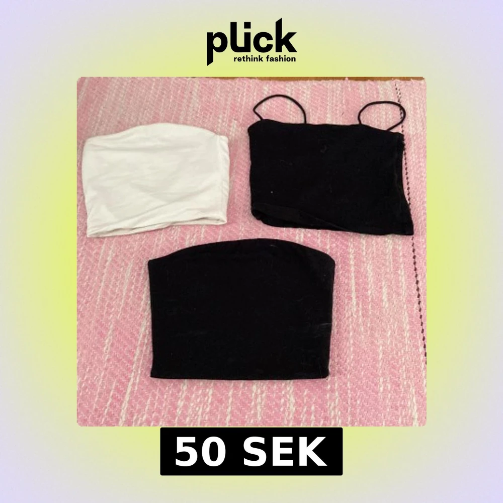 Säljer två svarta och en vit tubtopp. En av de svarta topparna har smala axelband medan de andra är axelbandslösa. Perfekta för sommardagar eller som basplagg i garderoben.