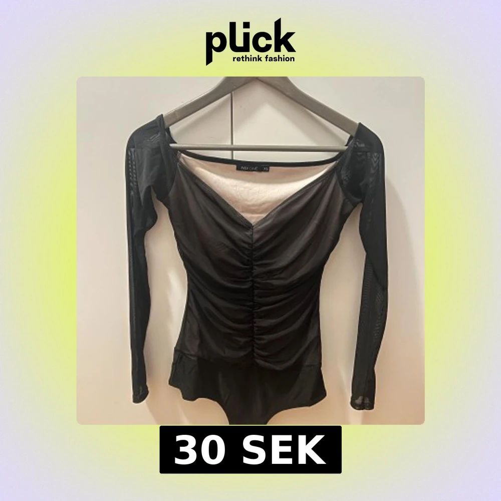 Snygg svart mesh body topp från NLY One i storlek XS. Toppen har långa ärmar och en v-ringad design med rynkdetaljer framtill. Perfekt för en kväll ute eller en speciell tillställning.