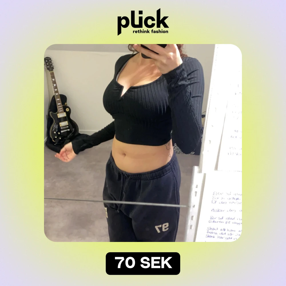 Säljer en snygg svart ribbad topp med lång ärm och v-ringning. Den är croppad och passar perfekt till både vardag och fest. Toppen är i mycket bra skick och ger en stilren look.