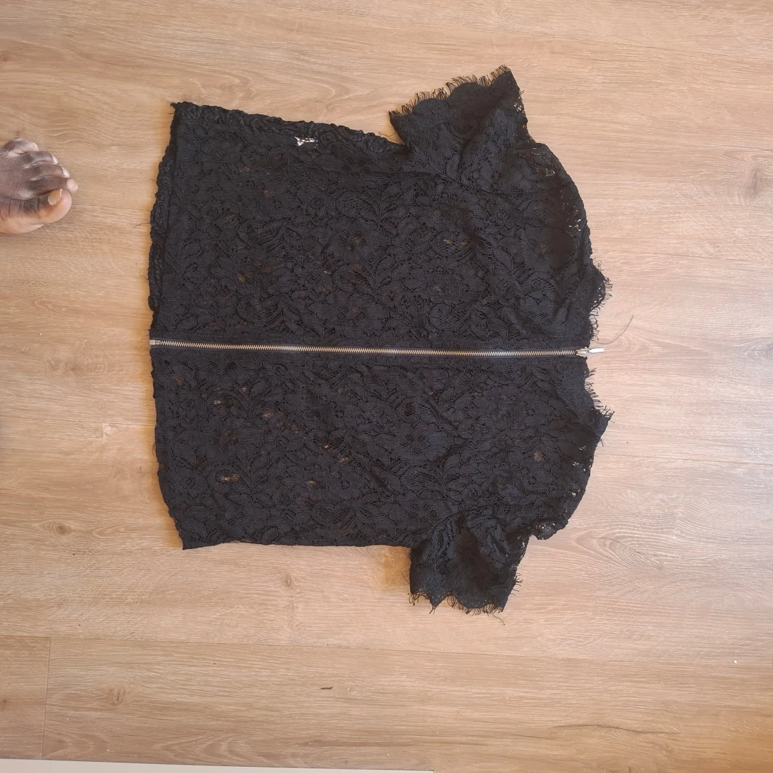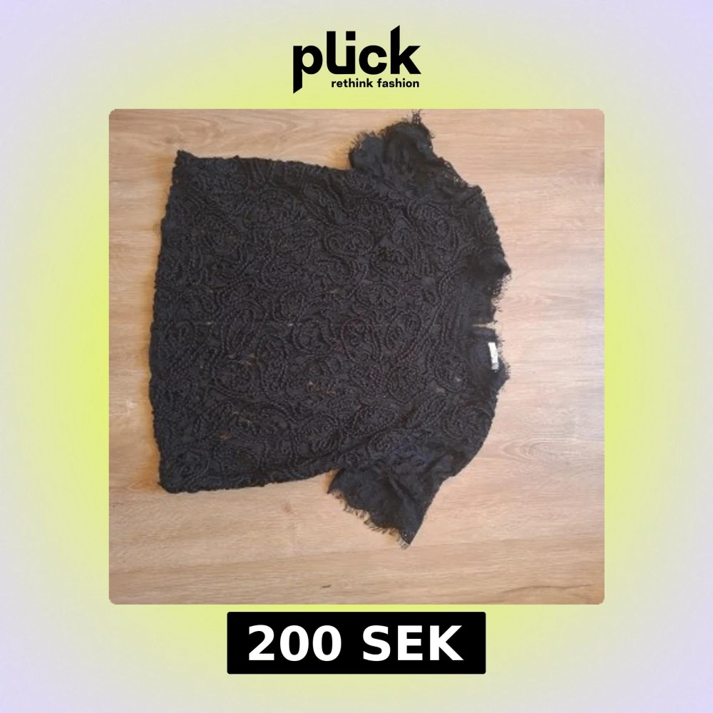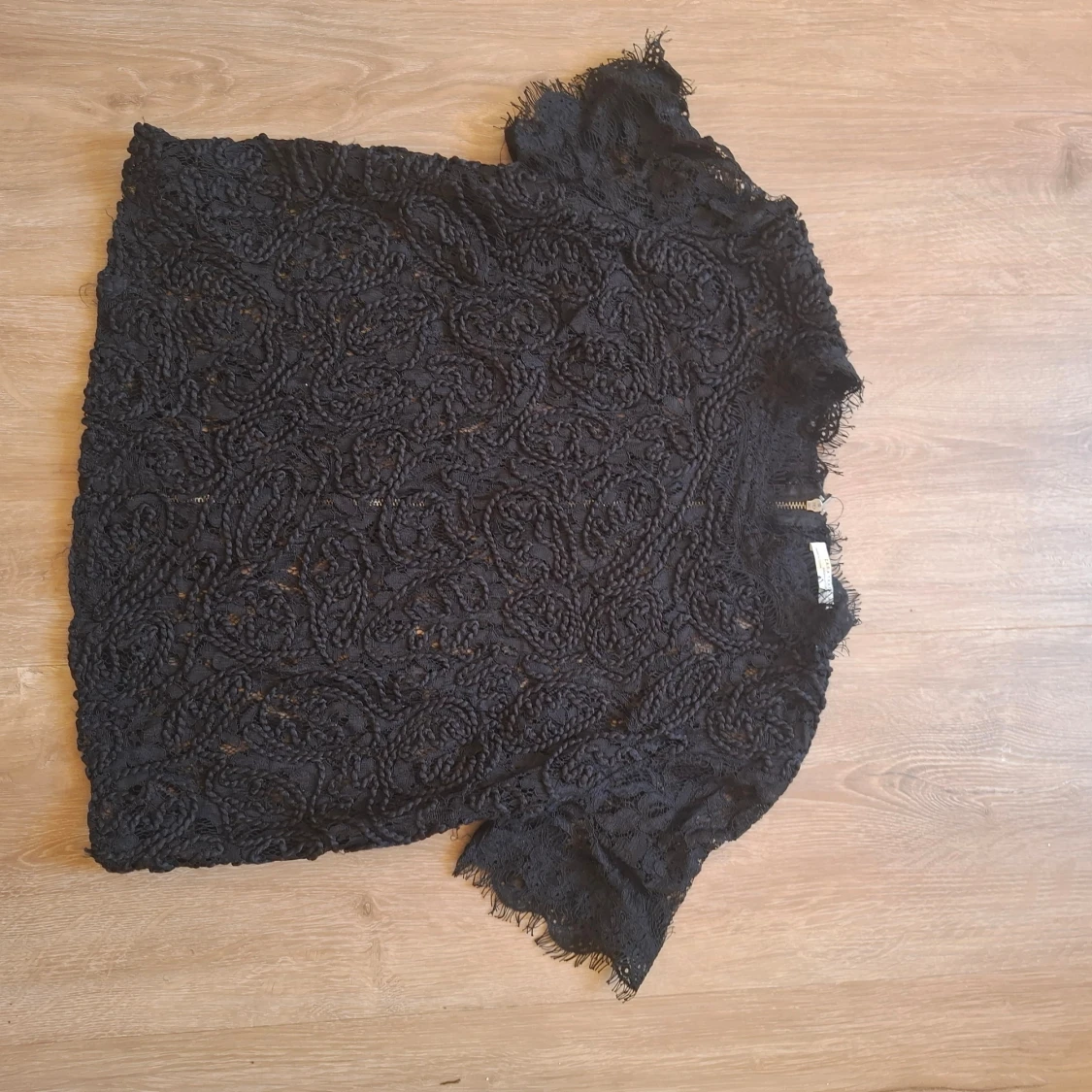 Säljer en svart blus i spets med korta ärmar och fina spetsdetaljer. Blusen har rund halsringning och ett elegant mönster i tyget. Perfekt för dig som vill ha en stilren och trendig topp.