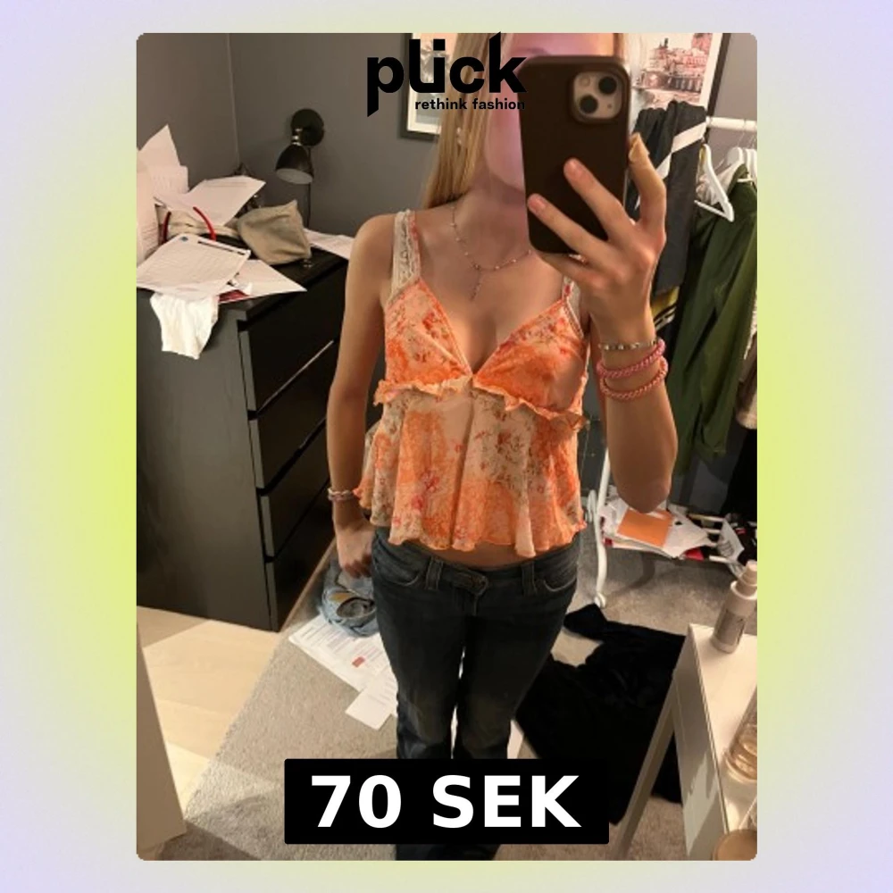 Supersöt linnetopp med blommigt mönster i orange och beige toner. Toppen har volangdetaljer, v-ringning och tunna axelband. Perfekt för sommarens varma dagar och ger en riktigt trendig vibe. Väldigt fin när man är brun
