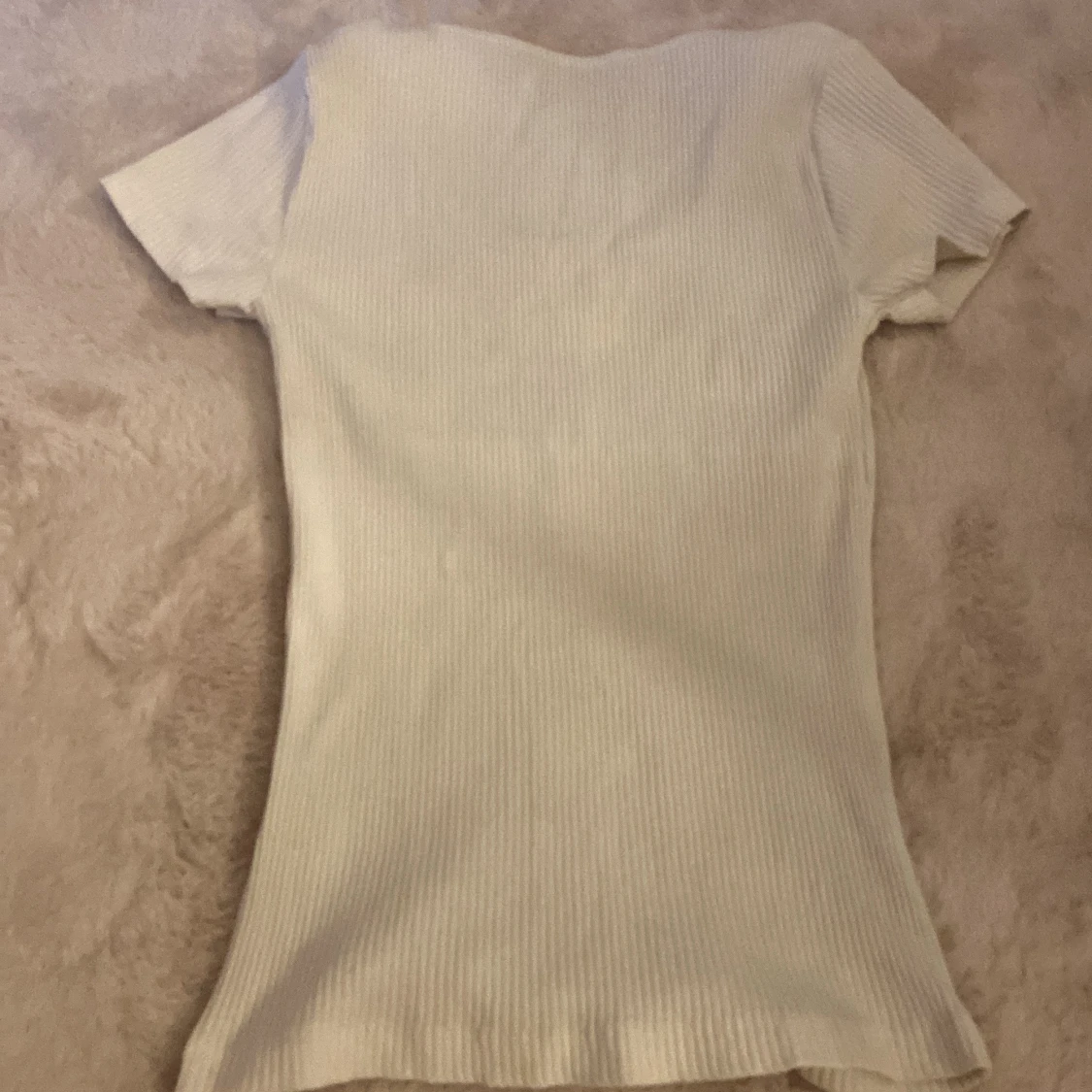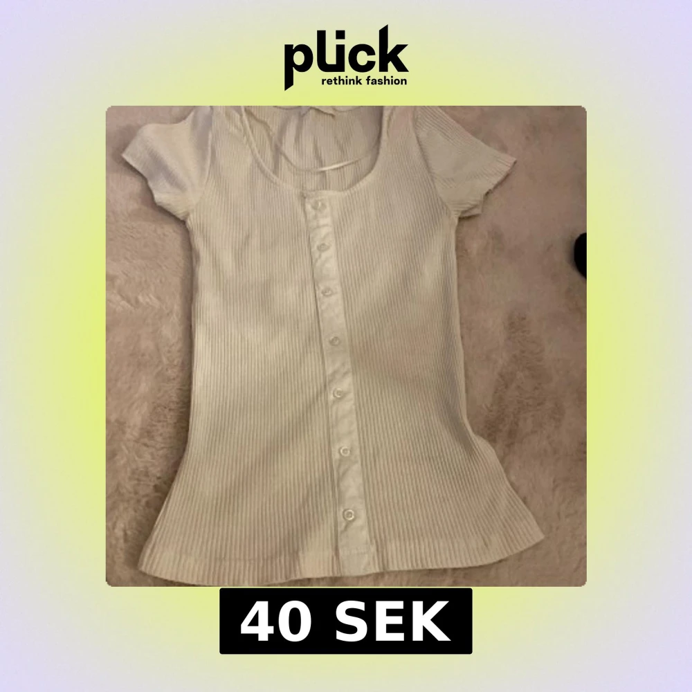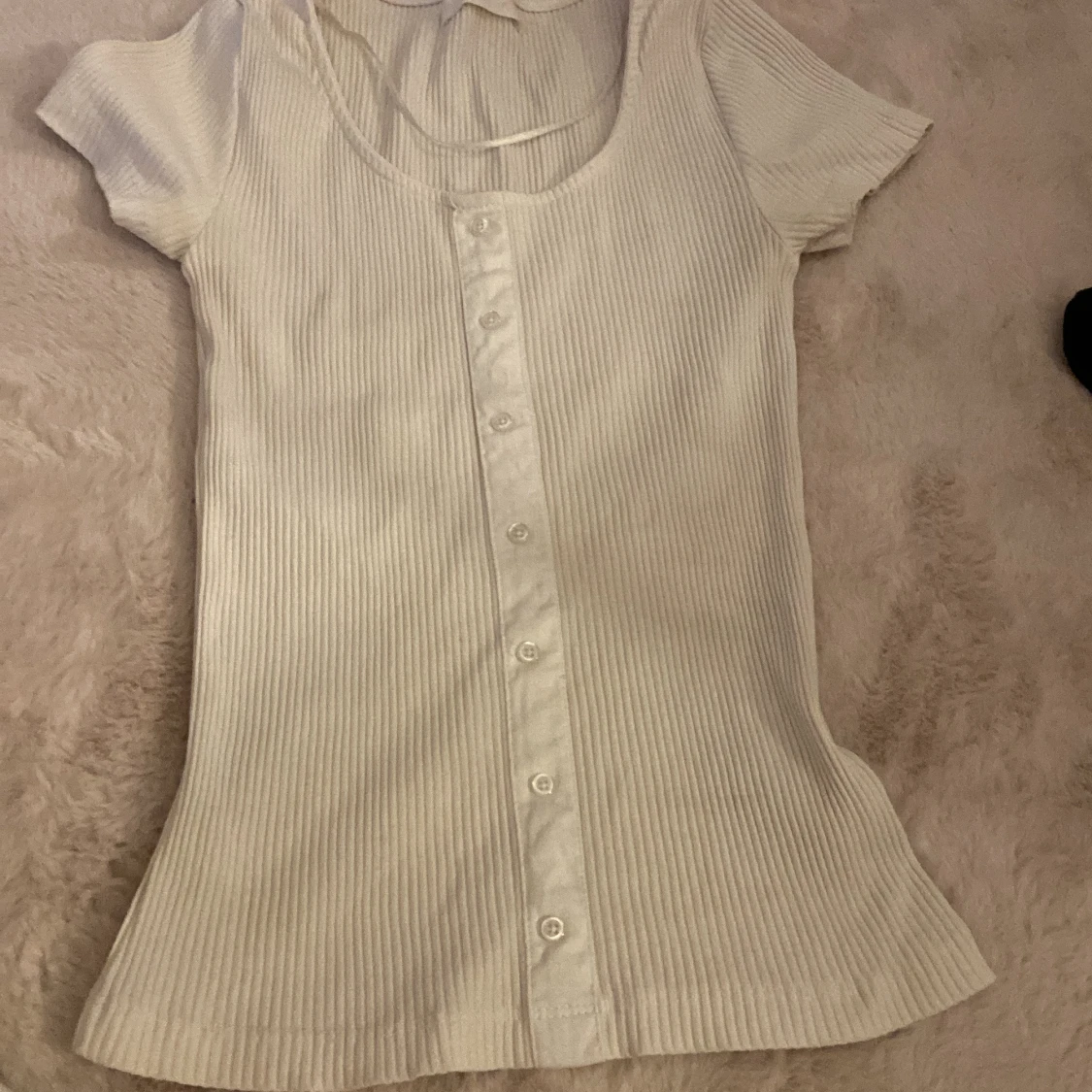 Supersöt vit ribbad topp med korta ärmar och knappar hela vägen framtill. Den har en rundad urringning och är figurnära i modellen. Perfekt att styla med jeans eller kjol för en clean look.