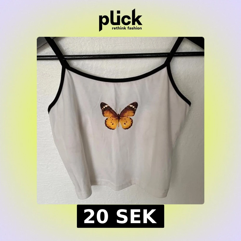 Snygg vit croppad linnetopp från SHEIN med tunna svarta axelband och svarta kanter. Framtill finns ett tryck med en gulbrun fjäril som ger toppen en cool vibe. Perfekt för dig som gillar detaljer och vill sticka ut lite extra.