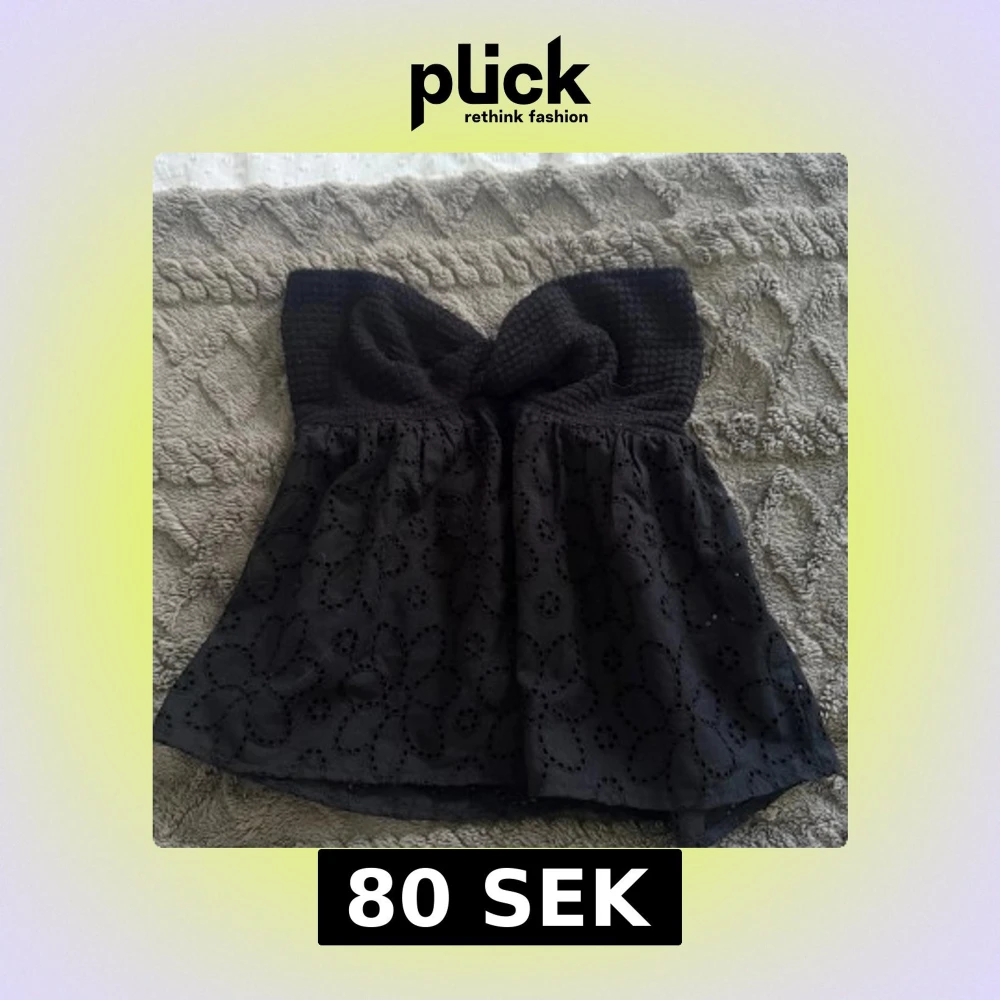 Säljer en svart bandeau tubtopp med broderade blommor och spetsdetaljer. Toppen har en snygg knut framtill och är axelbandslös, perfekt för dig som vill ha en cool och feminin look. Materialet är mjukt och luftigt med broderad spets.