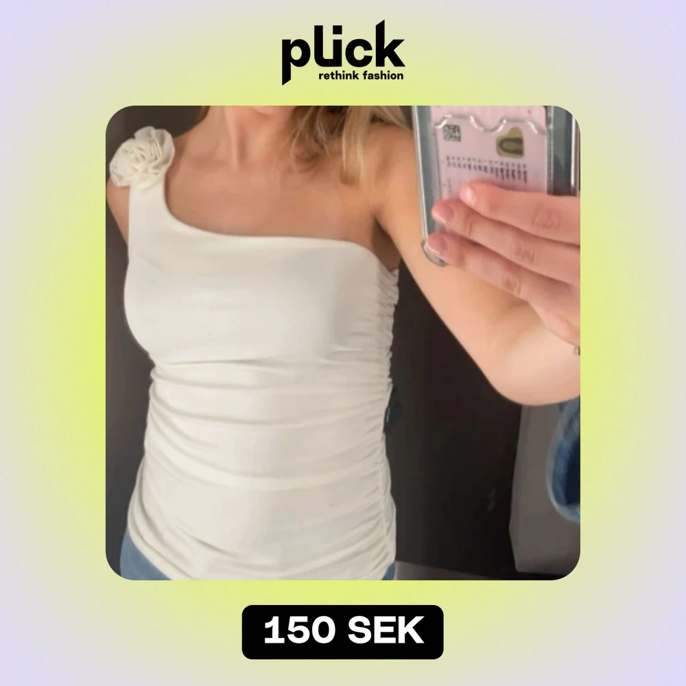 Säljer en superfin vit oneshoulder topp med en söt blomdetalj på axeln. Den är gjord i ett mjukt och stretchigt material som sitter bekvämt hela dagen.